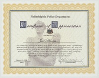 Philadelphia Police Department Certificate of Appreciation presented to Jaci Adams