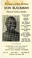 Reducing and Body Building, Don Blackman, Physical Culture Studios This leaflet serves as an advertisement for Don Blackman's exercise studio. It is one sided featuring a black and white portrait and contact information. It lists the facilities and programs available, including a gym, steam tables, massages, self-defense courses, and sun lamp treatments. Also included are Don Blackman's credentials as "Undefeated Light Heavyweight Champion of the World". 8 1/2 cm. x 16 cm.