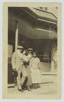 Christine Moore Howell; her sister, Bessie; and two men in front of "Christine" Vanity Parlor.