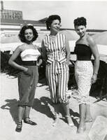 [African-American women pose carrying beach supplies in Atlantic City.] A black and white photograph taken by John W. Mosley. The image features three stylish, unidentified Black women posing on the steps of the boardwalk near Chicken Bone Beach in Atlantic City, New Jersey. Belongings in hand, two of the women smile directly towards the camera, while the other smiles while looking to the side.