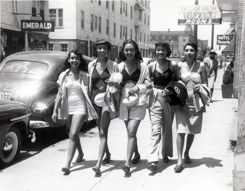 Hotel signs are visible behind the women: Emerald Hotel, Ocean View Hotel, and Hotel Victoria. According to old Atlantic City Press newspaper classified ads and articles between 1940-1972, it appears that this photo was taken on Missouri Avenue, not Kentucky Avenue. Emerald Hotel’s location appears to be 116 S. Missouri Ave (Atlantic City Press 1940), Ocean View Hotel at 117 S. Missouri Ave (Atlantic City Press 1953), and Villa Victoria Hotel at 115 S. Missouri Ave (Atlantic City Press 1972). This street has an entrance to Chicken Bone Beach beachfront access. The hotspot that was Kentucky Avenue is less than a mile east of this location.