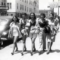 Five smiling women take a coordinated step forward down what was thought to be Kentucky Avenue, but upon research was discovered to be Missouri Avenue. They are wearing various styles of bathing suits, three are wearing unbuttoned button-down shirts, one is wearing trousers with a belt, and one is wearing a skirt. Four of the five women are carrying bags and/or additional clothing. Two men are walking behind them.