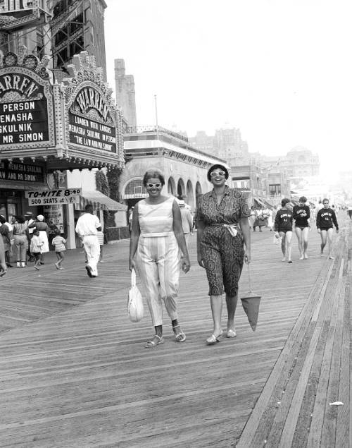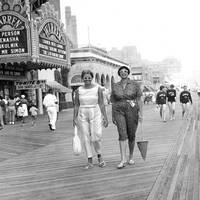 A black and white photograph taken by John W. Mosley. The image features two stylish Black women walking the boardwalk near Chicken Bone Beach in Atlantic City, New Jersey. The pair smile while sporting cat-eyed frame sunglasses. The Warren Theater–formerly the Warner Theater and currently The Hook–sits in the background.