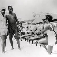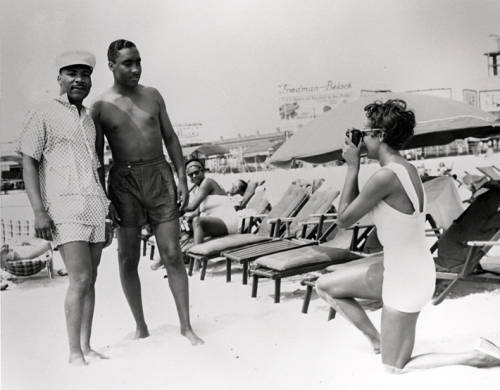 This photograph is of Rev. Dr. Martin Luther King Jr. (January 15, 1929-April 4, 1968) with Rev. Russell A. Roberts (1923-February 11th, 1959) posing together in beachwear on Chicken Bone Beach in Atlantic City, NJ. Rev. Dr. King is looking straight at the camera, and Rev. Roberts is posing to the right at a kneeling female photographer. The two were friends and former seminarians (Rosenberg 2022). Joseph Louis Barrow (May 13, 1914-April 12, 1981), otherwise known as Joe “Brown Bomber” Louis, said to be featured to the left of Rev. Dr. King reclined in a beach chair (Rosenberg 2022).