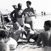 A black and white photograph taken by John W. Mosley (1907-1969). The photo features heavyweight boxing champion Joe Louis (1914-1981) who sits in the center socializing with eight people on Chicken Bone Beach in Atlantic City, New Jersey. From 1937 to 1949, Joe Louis reigned as the heavyweight boxing champion of the world. He defended his title 25 times and was beaten only three times (Martha Louis 1991).