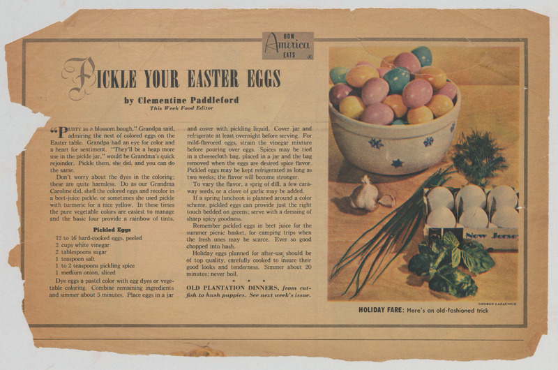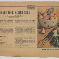The front and back of a clipping pasted in a scrapbook from the Mother Bethel African Methodist Episcopal (AME) Church. The clipping contains a recipe for pickling dyed Easter eggs written by culinary journalist Clementine Paddleford. The back contains various advertisements.