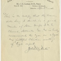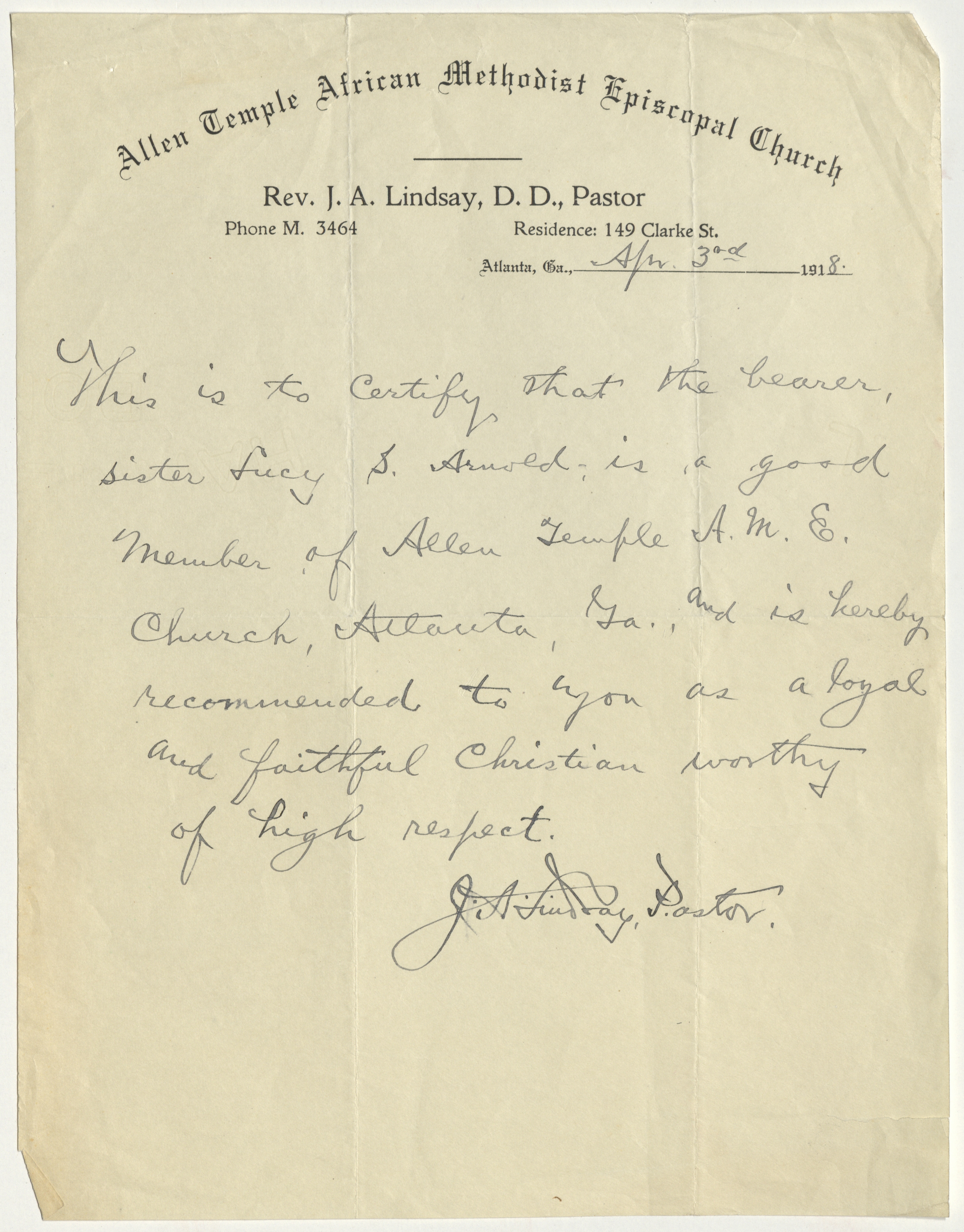 Membership letter written by Pastor Lindsay on behalf of Lucy Arnold