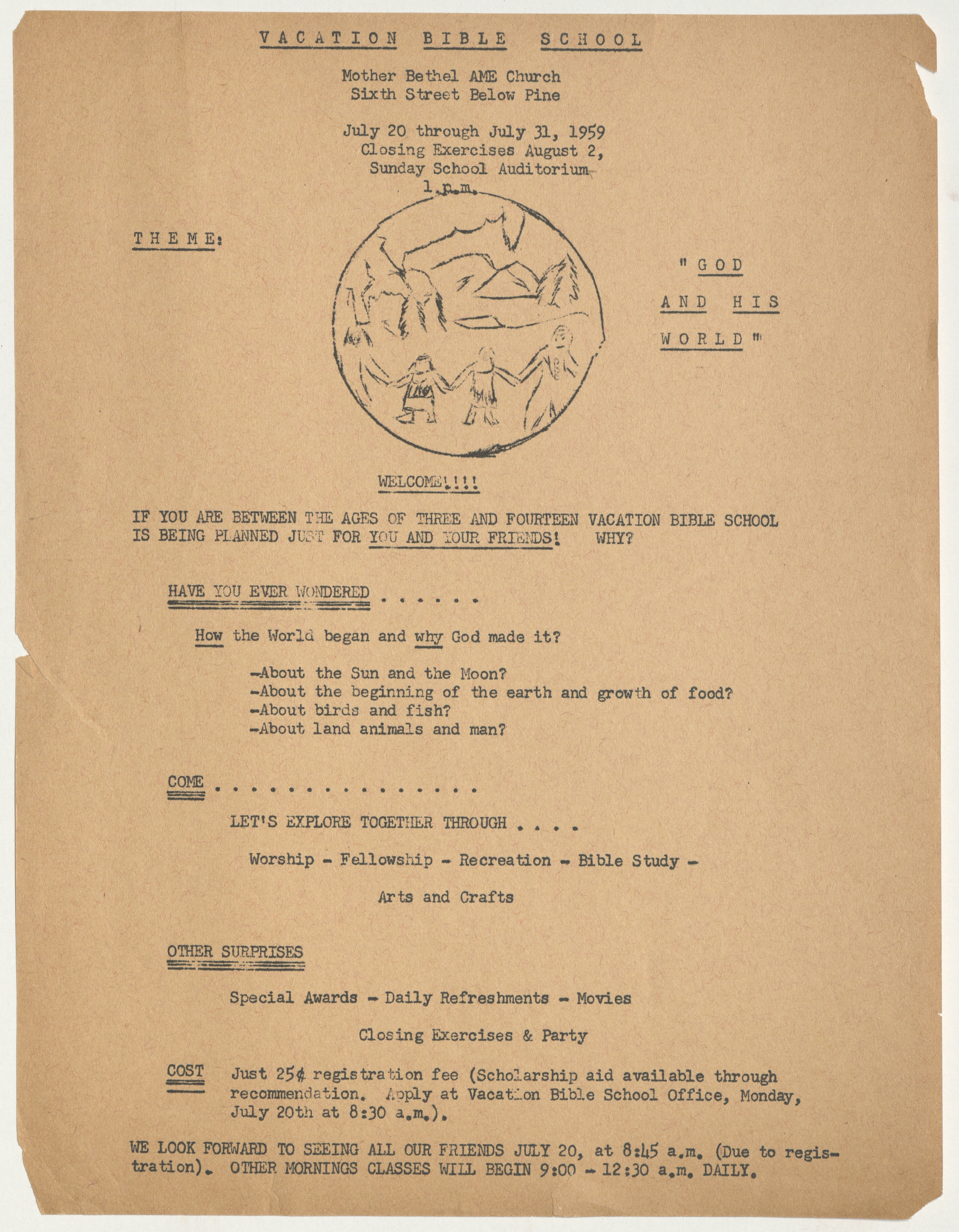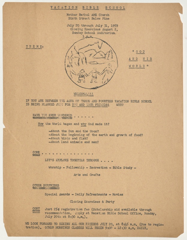 The closing exercises and party are noted to be held August 2nd. Youth 3-14 are invited to gather with peers to explore existential questions like “how the World began and why God made it?” Hence, the theme of “God and His World.” In 1795, Mother Bethel organized the first Black Sunday School– meaning this Vacation Bible School held 164 years later is an instance of the church’s commitment to religious education (Howell 2009). The church continues to offer Sunday School and Bible Study, however the land and figures that shaped Mother Bethel are far more historically profound than the programming.