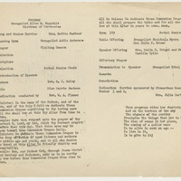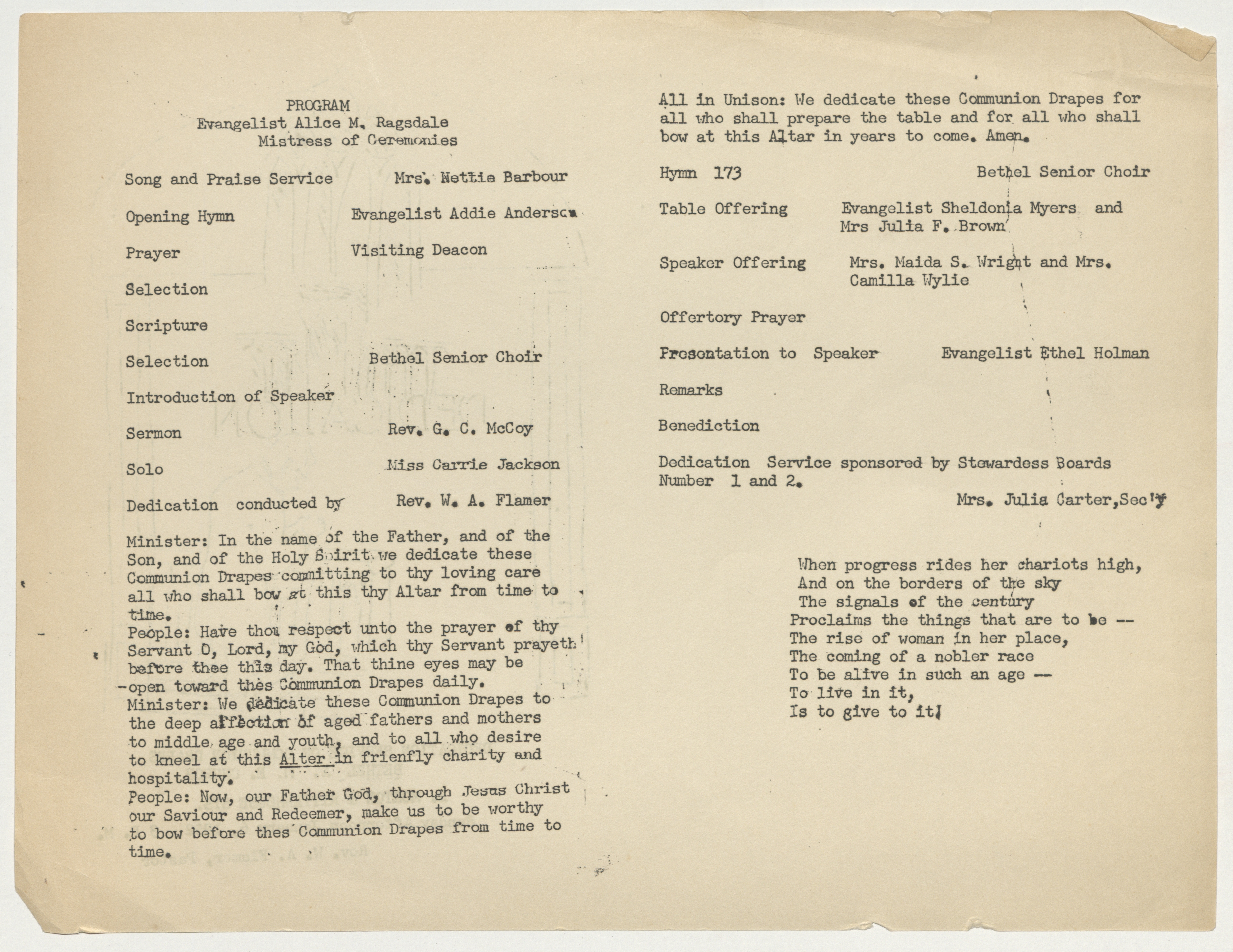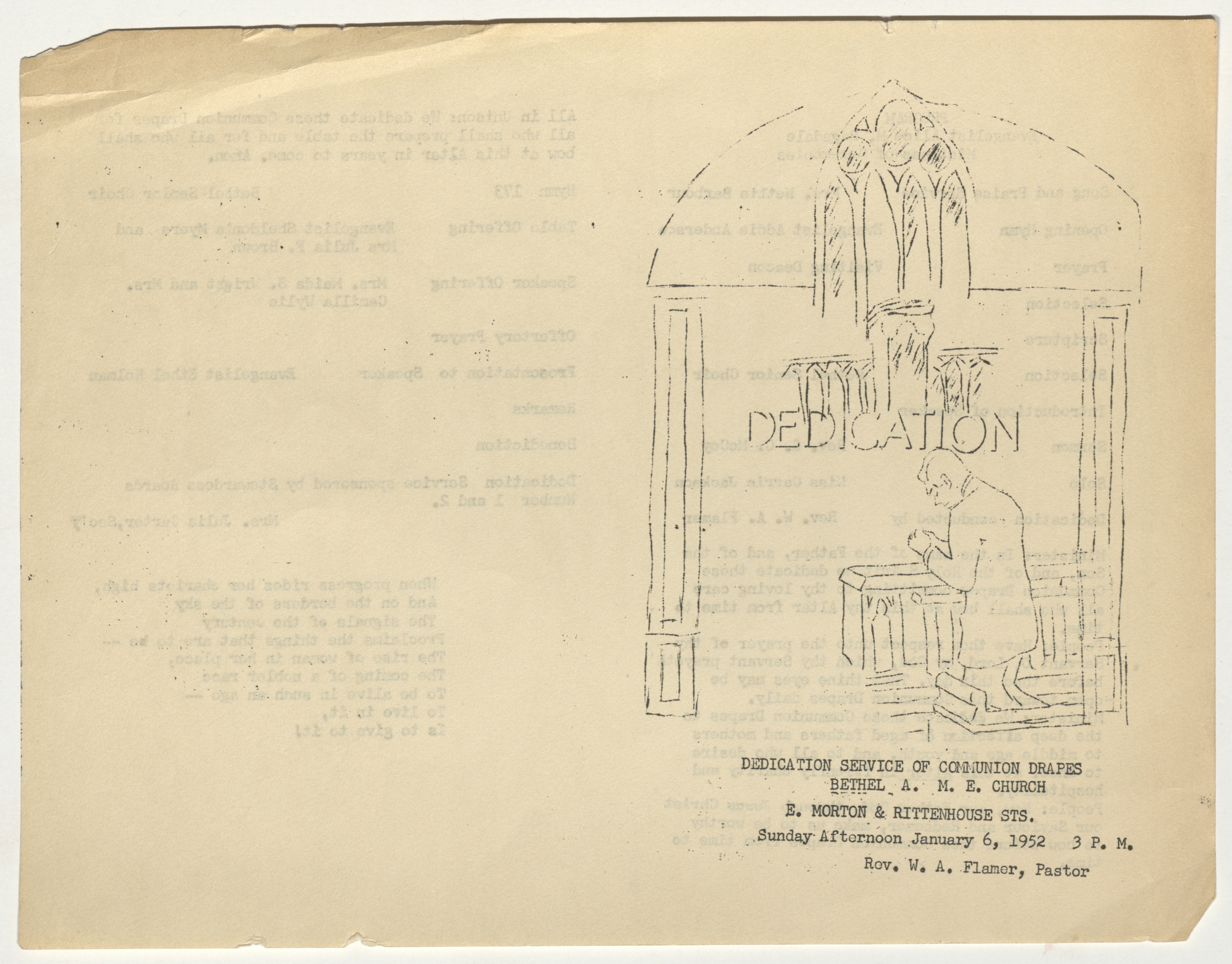 This ceremony documented a church dedication service at Bethel African Methodist Episcopal on January 6, 1952. Located on Rittenhouse Street in the Germantown section of Philadelphia, the program celebrated the consecration of new communion drapes. The service blended liturgy with community devotion, invoked the Trinity and called all generations to gather in unity.