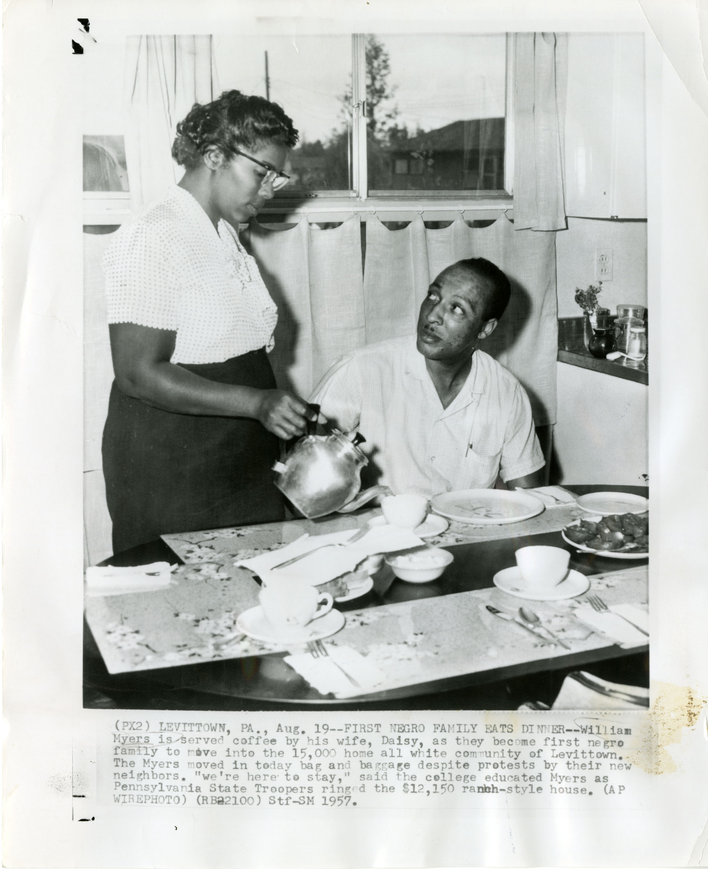This item is a black and white glossy photograph of William and Daisy Myers having dinner in their Levittown home. The couple are dressed in casual attire as William sits at the table while Daisy pours him coffee. When Levittown was first created the housing agreements included racist policies barring people of color from living in the community. The Myers became the first Black family to move into the 15,000 home all-White Levittown community in Bristol Township. They moved out of the integrated housing community of Bloomsdale to 43 Deepgreen Lane in Levittown, PA in August 1957.