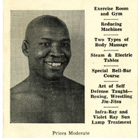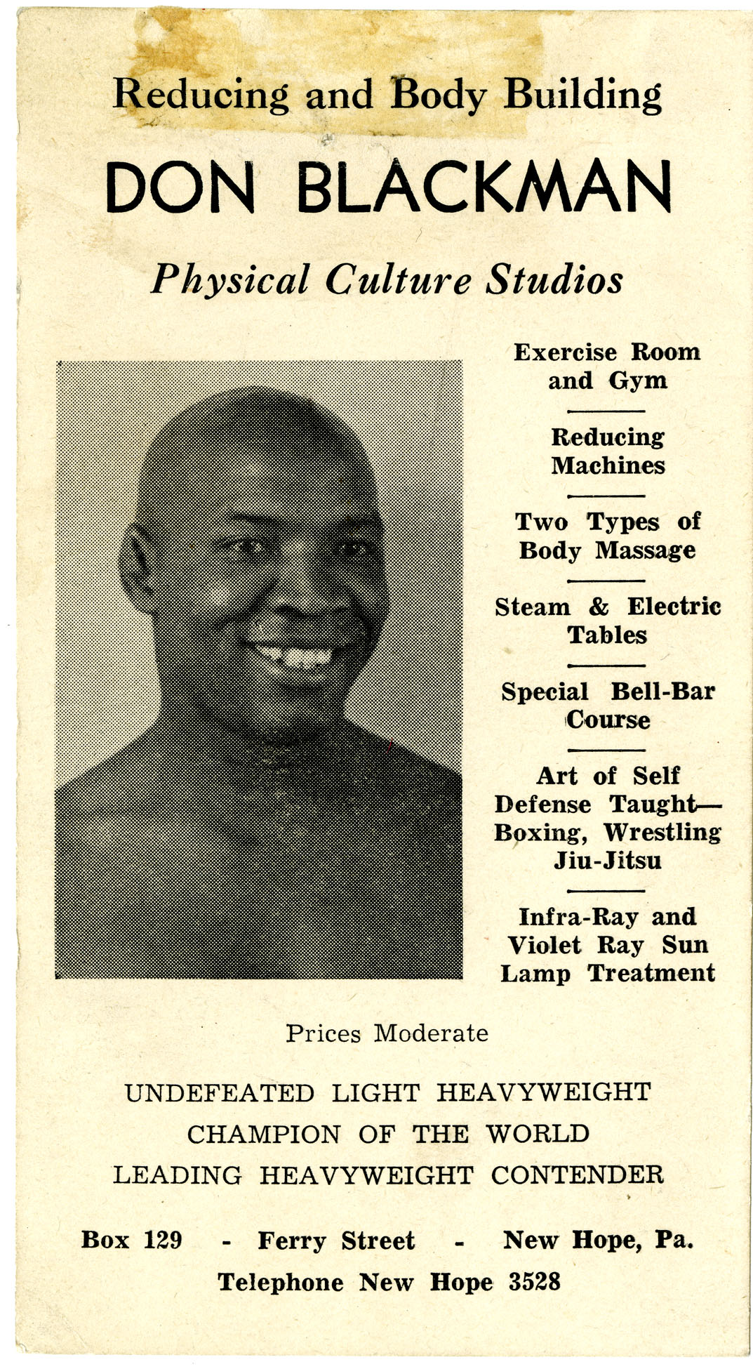 This leaflet serves as an advertisement for Don Blackman's exercise studio. It is one sided featuring a black and white portrait and contact information. It lists the facilities and programs available, including a gym, steam tables, massages, self-defense courses, and sun lamp treatments. Also included are Don Blackman's credentials as "Undefeated Light Heavyweight Champion of the World". 8 1/2 cm. x 16 cm.