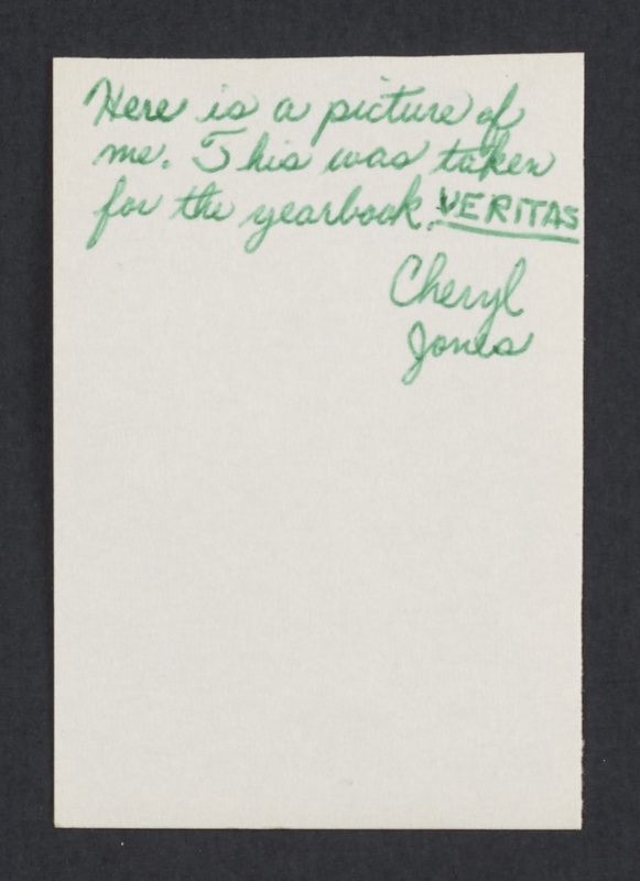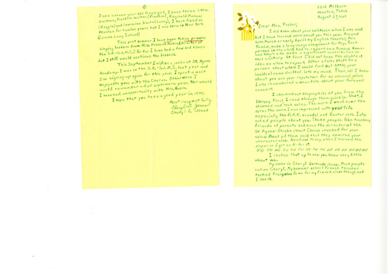 An envelope, two-page letter, and signed photograph mailed by high school student and aspiring singer Cheryl G. Jones to globally renowned contralto Marian Anderson Fisher (1897-1993). The letter is among many letters from aspiring singers and musicians included in the Marian Anderson Papers. Anderson's life was an inspiration to them and to countless others in the United States and abroad (Kruesi 1998).