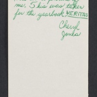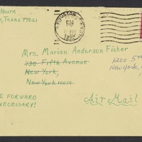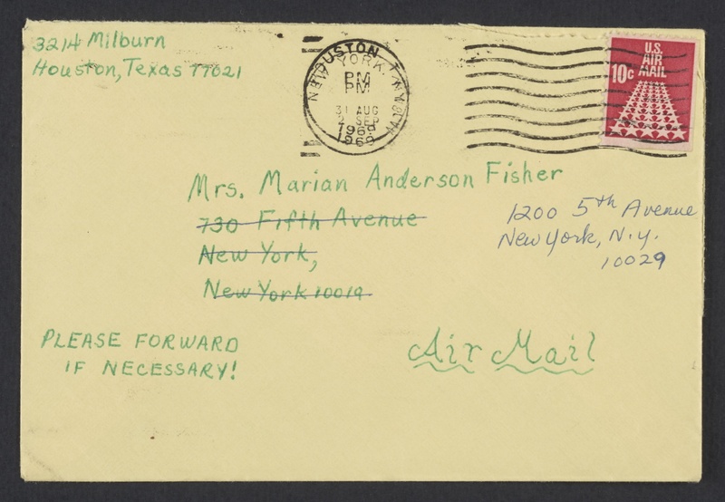 In the letter, Jones talks of her process and success of writing a report on Anderson for a school assignment. Jones also shares biographical information about herself. The photograph is an image of Jones taken for her high school yearbook, which she inscribed and signed on the back. The envelope features two postmark dates, a lined through address to which Jones originally mailed the letter and a new address to which the mail was forwarded.