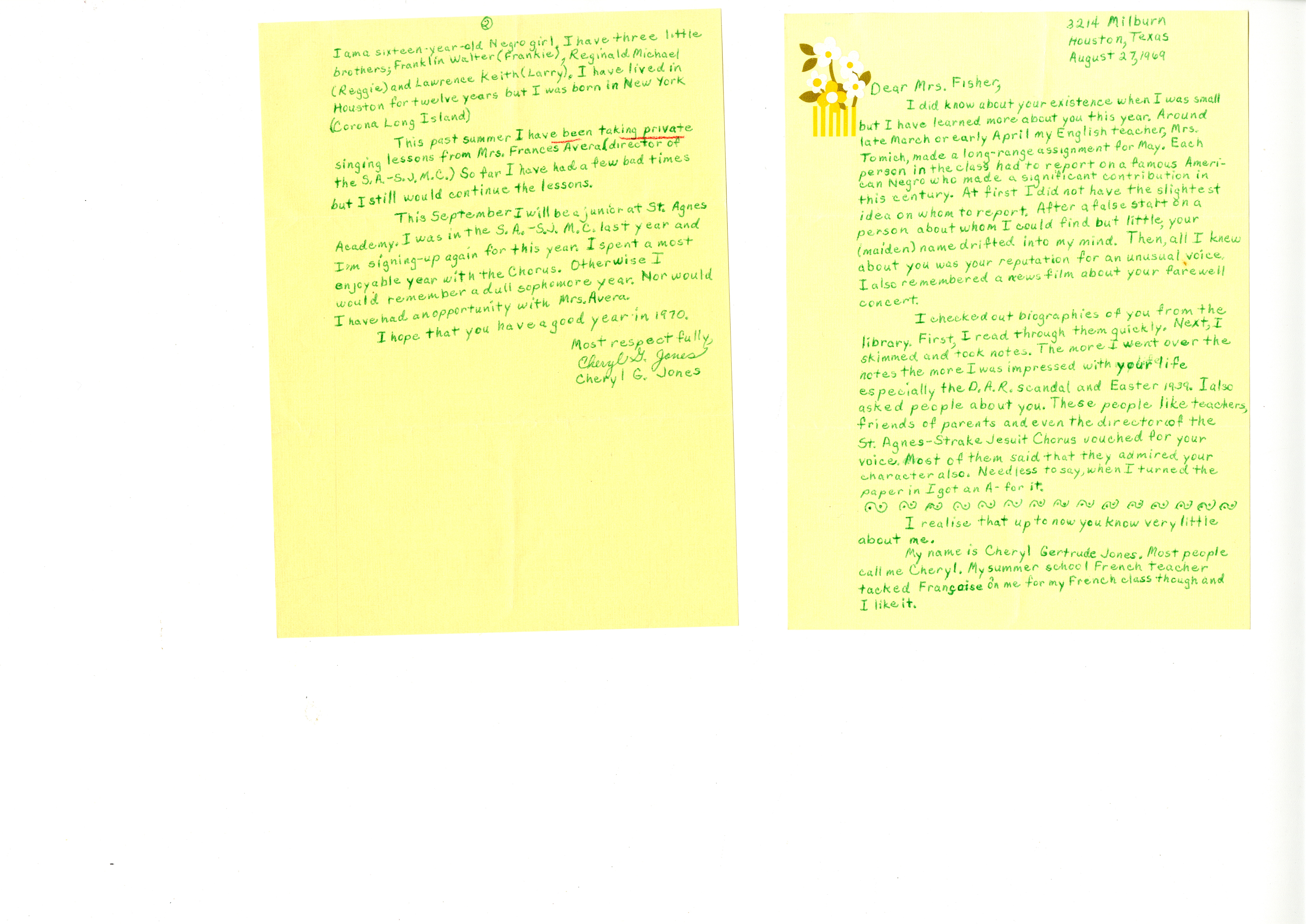 Letter, Cheryl G. Jones to Miss Anderson, August 27, 1969