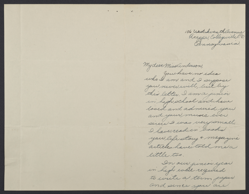 My dear Miss Anderson, You have no idea who I am and I suppose you never will, but by this letter. I am a junior in high school and have loved and admired you and your music ever since I was very small. I have read in books your life story & magazine articles have told me a little too.