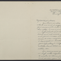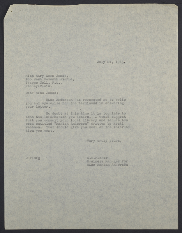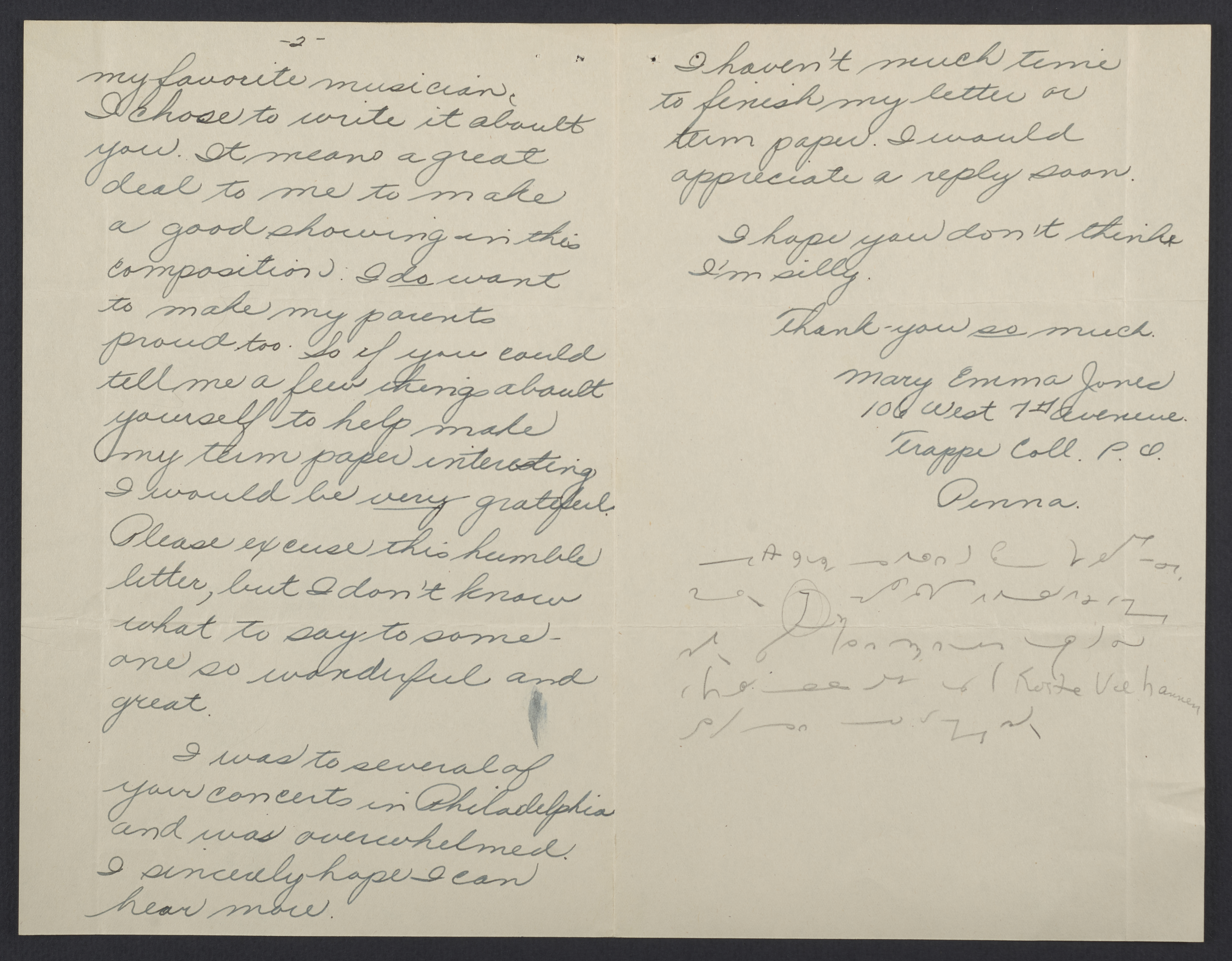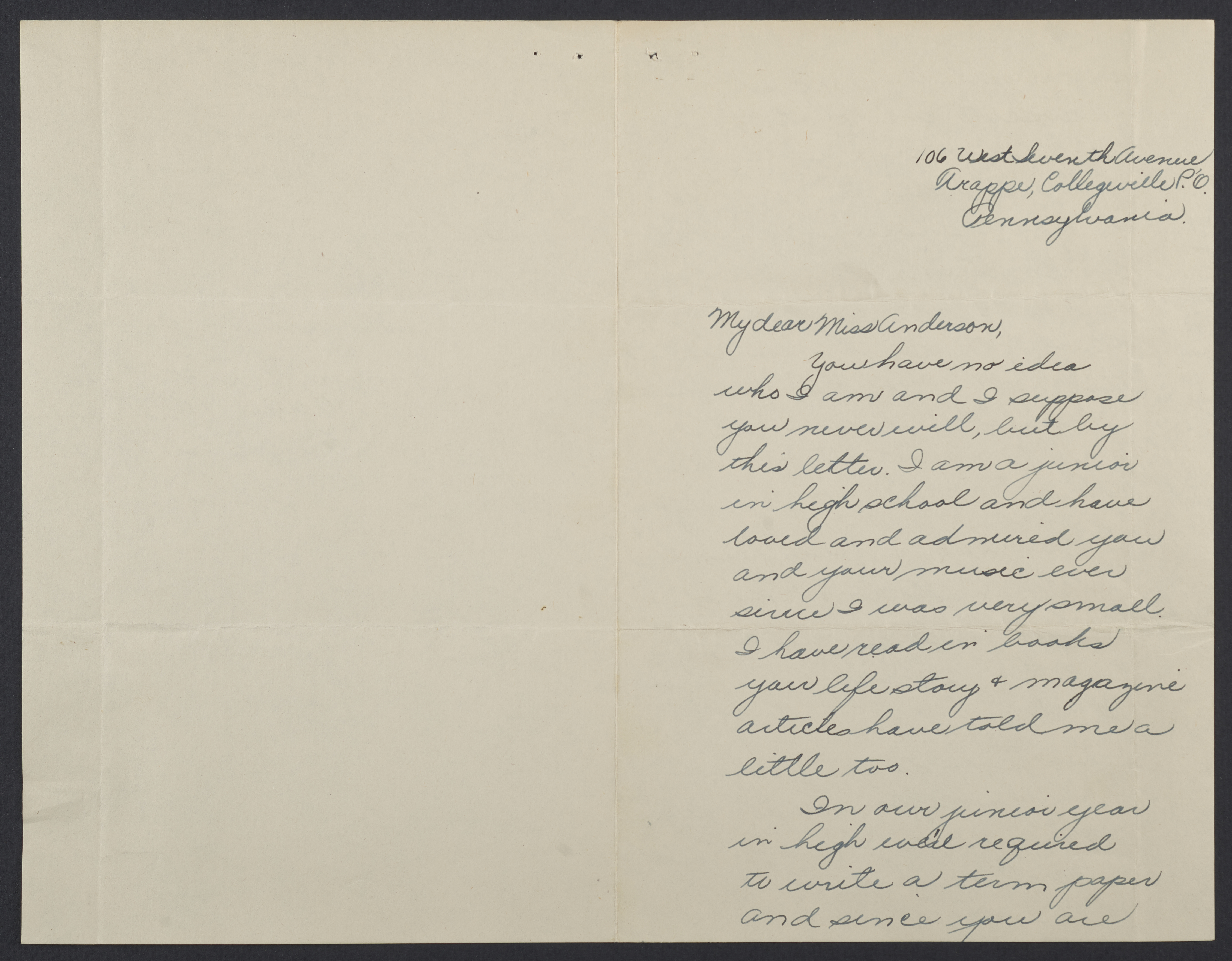 This letter was sent by Mary Emma Jones (1928-) of Trappe, Collegeville, Pennsylvania to Marian Anderson (February 27, 1897-April 8, 1993) in 1945, presumably towards the end of Mary’s junior year at Collegeville Trappe High School. The purpose of this letter is to request compelling information from Anderson so that her junior year term paper would be impressive, and make her parents proud (page 2). Jones repeatedly offers compliments, gratitude, and appreciation to Anderson. She notes that she has attended Anderson’s concerts in Philadelphia, which would be about an hour (roughly 32 miles) from Collegeville, PA.