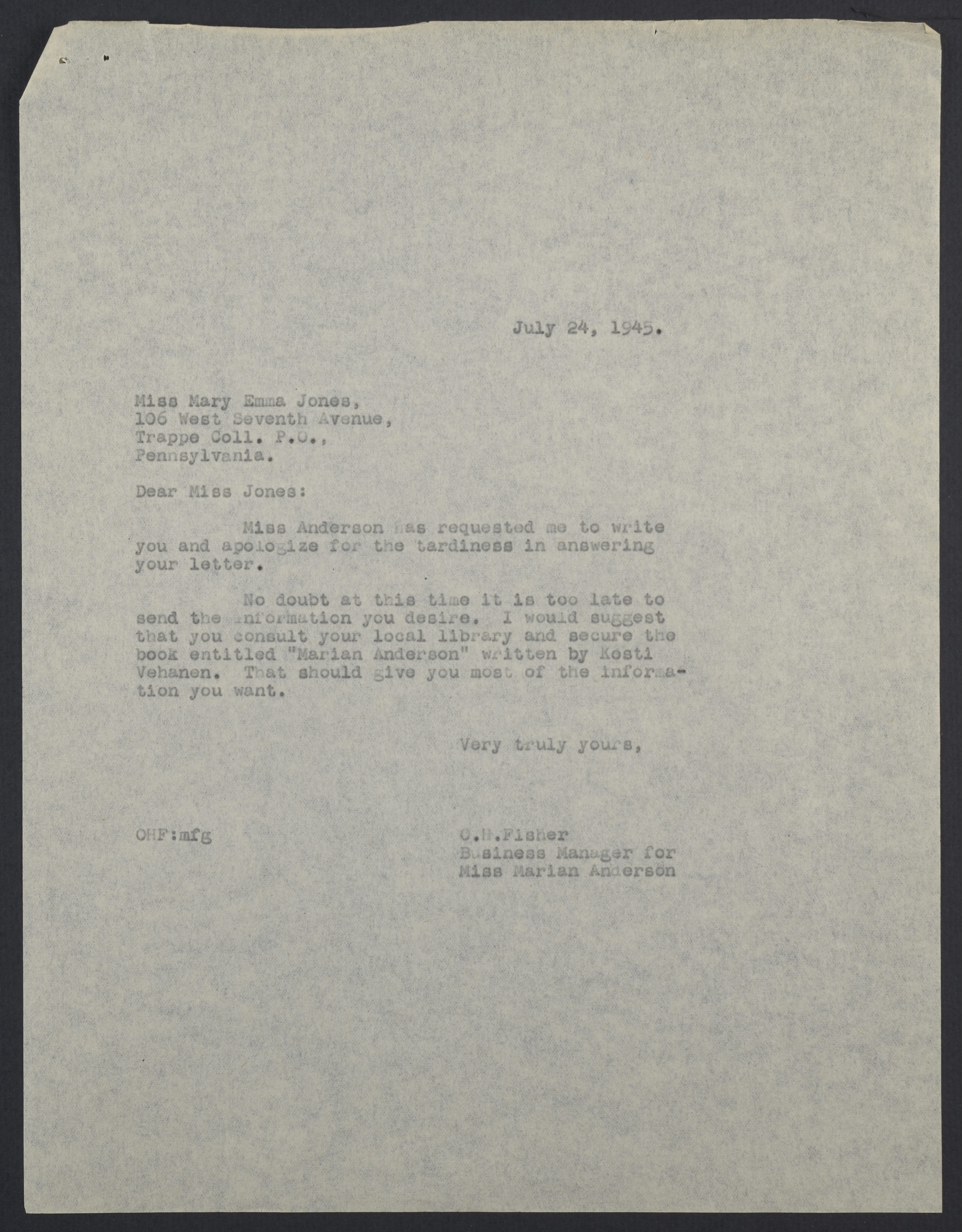 Anderson’s Business Manager Orpheus “King” Hodge Fisher (1900-1986) responded on July 24, 1945, per the request of Anderson. He was also an architect and eventually her husband, married on July 24, 1943 (Tatman 2025; Penn Libraries, n.d.). He apologizes for the tardy reply, and advises her to: “consult her] local library” for the book “Marian Anderson” by Kosti Vehanen. Vehanen (August 31, 1887-March 13, 1957) above all a Finnish pianist and composer, but he also wrote a number of memoirs, one of which being the one Fisher recommended (Discography of American Historical Recordings, n.d.).