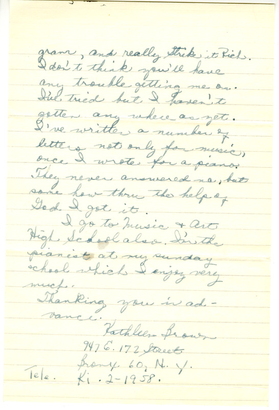 I’d like to know if you could write a letter to Strike it Rich for me, so I could [ ] go on their pro-gram, and really Strike it Rich. I don’t think you’ll have any trouble getting me on. I’ve tried but I haven’t gotten any where as yet. I’ve written a number of letters not only for music, once I wrote for a piano. They never answered no, but some how thru the help of God I got it.