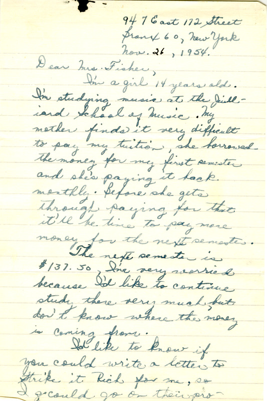 A two-page, handwritten letter from music student Kathleen Brown to globally renowned contralto Marian Anderson Fisher (1897-1993). In the letter, Brown describes financial constraints in paying for her tuition at Juilliard School of Music. She asks for Marian Anderson to write a letter to the radio game show “Strike It Rich.”