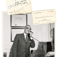 A black and white photograph taken by John W. Mosley (1907-1969) featuring William “Bill” Arthur Upshur Jr. (1894-1963) on the phone at his office desk. His business card for his funeral home is stapled to the photo. Another photo flipped right side down sits above. It has handwritten inscriptions.