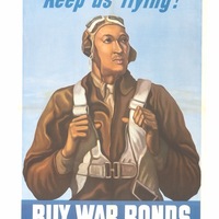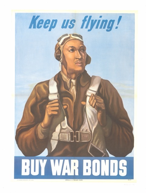 The poster features a portrait by Betsy Graves Reyneau (1888-1964) of Major Robert W. Deiz (1919-2004), an African American Tuskegee Airman. Major Deiz gazes upward while wearing a flight jacket and gear in front of a blue sky background. Above him, blue, italicized letters read ‘Keep us flying!’. Below him white lettering on a dark blue background reads ‘BUY WAR BONDS’.