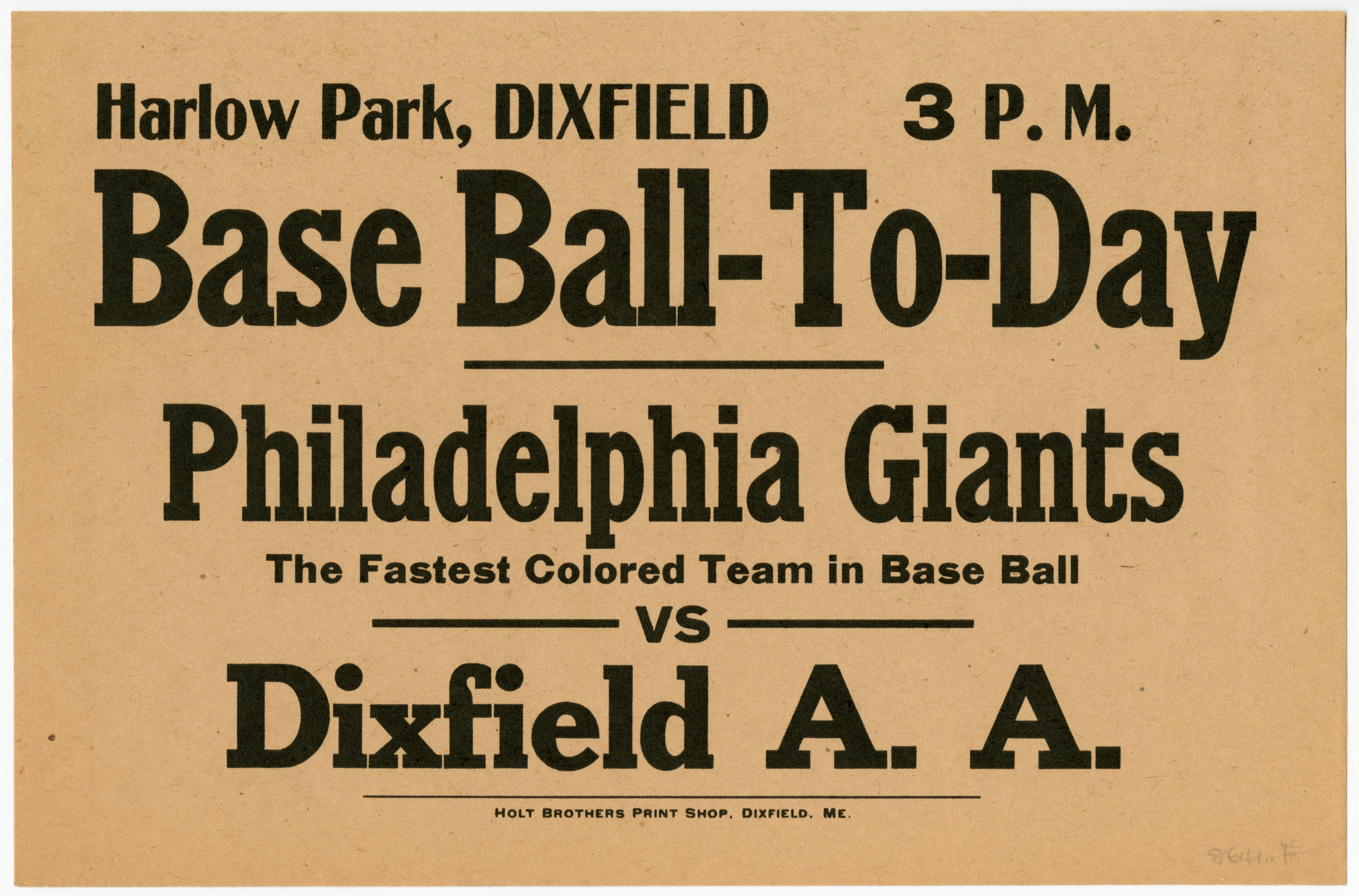 The Handbill for Philadelphia Giants game, playing at Harlow Park, Dixfield at 3 P.M. Formed in 1902, the Philadelphia Giants was a powerhouse independent Black team until disbanding in 1911, forced by player defections (Wikipedia contributors 2025).
