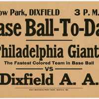 Because of blatant racism and the limited number of Negro leagues at the time, the Philadelphia Giants were often faced with playing most of their games against white East Coast minor-leagues, such as the Dixfield AAs of Maine pictured in the undated handbill. Throughout the Philadelphia Giants short-lived existence the team belonged to multiple leagues, each having its own membership and racial characteristics. League membership comprised of the following:
