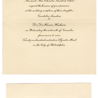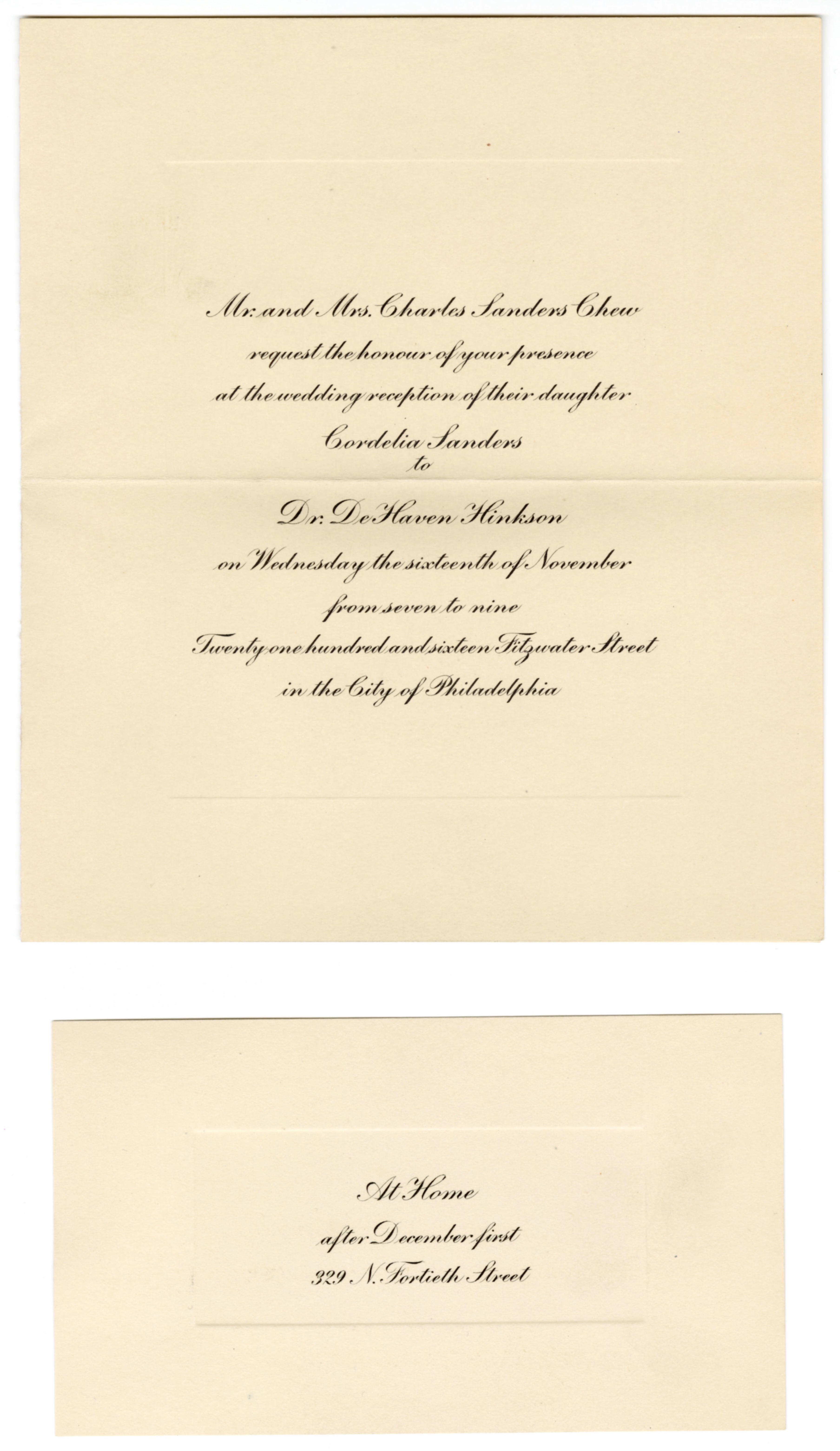 In 1921, Cordelia Chew (1897-1983) married Dr. DeHaven Hinkson (1891-1975), with whom she had two daughters, Cordelia “Betty” (b. 1922) and Mary (1925-2014). Although she is listed on the invitation as Cordelia Sanders, historical records are unclear as to whether she actually used her maiden name or her parents married name, of Chew, as her unmarried surname.