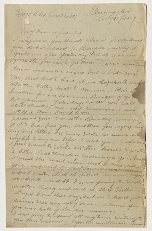 I suppose you think I have forsakened you. But I havent. I think us surely and would see you yesterday but it wasnt possible for me to get there. I was coming down Wednesday night but I broke my car, and had to leave it in Hopewell and take the trolley back to Glenmore. It is very lonesome for me here now. I thought of you every minute yesterday. I hope you will still think of me and remember I am still a true friend to you.