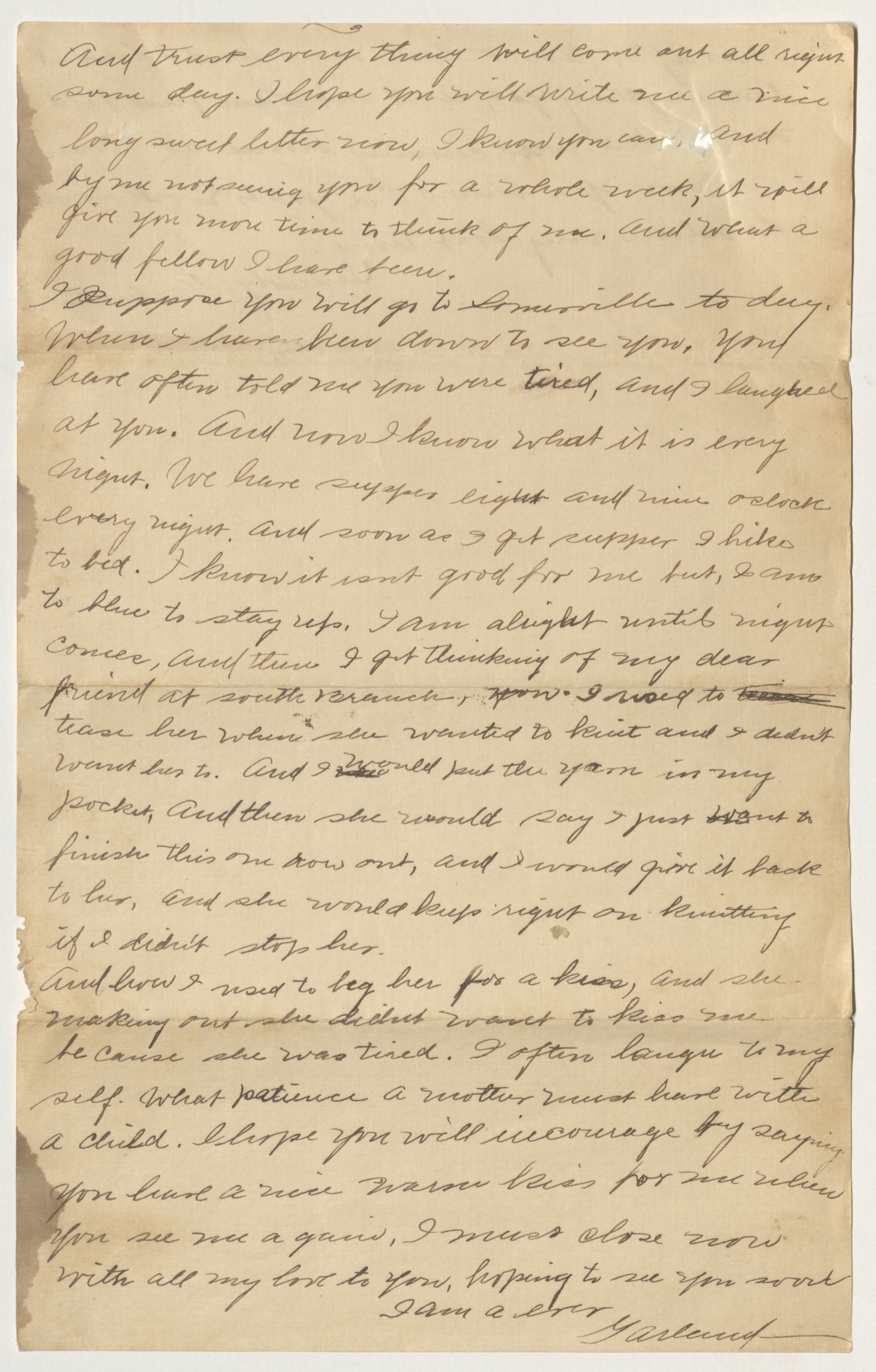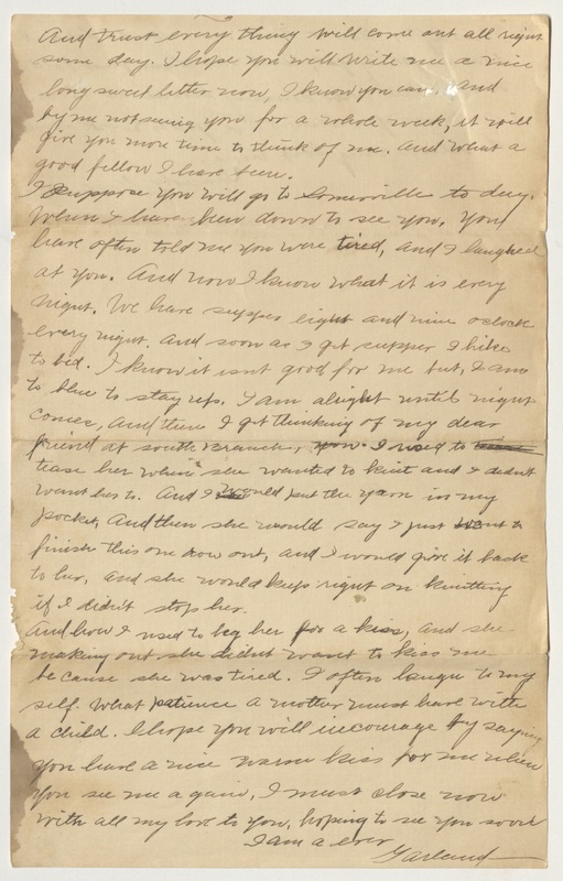 And how I used to beg her for a kiss, and she making out she didn’t want to kiss me because she was tired. I often laugh to my self. What patience a mother must have with a child. I hope you will incourage my saying you see me a gain. I must close now with all my love to you, hoping to see you soon.