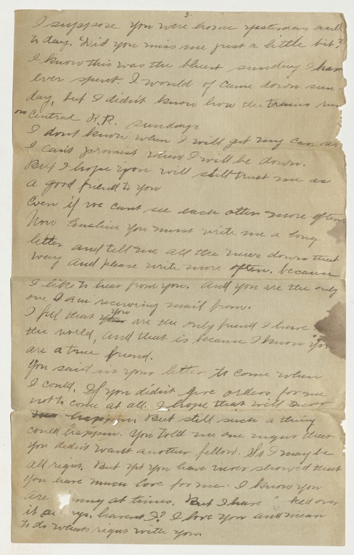 You said in your letter to come when I could. If you didn't give orders for me not to come at all. I hope that will never happen. But still such a thing could happen. You told me one night that you didn't want another fellow. So I maybe all right. But yet you have never showed that you have much love for me. I know you are [xxxx] at times. But I have [xxxx] over it always, haven’t I? I love you and mean to do whats right with you.