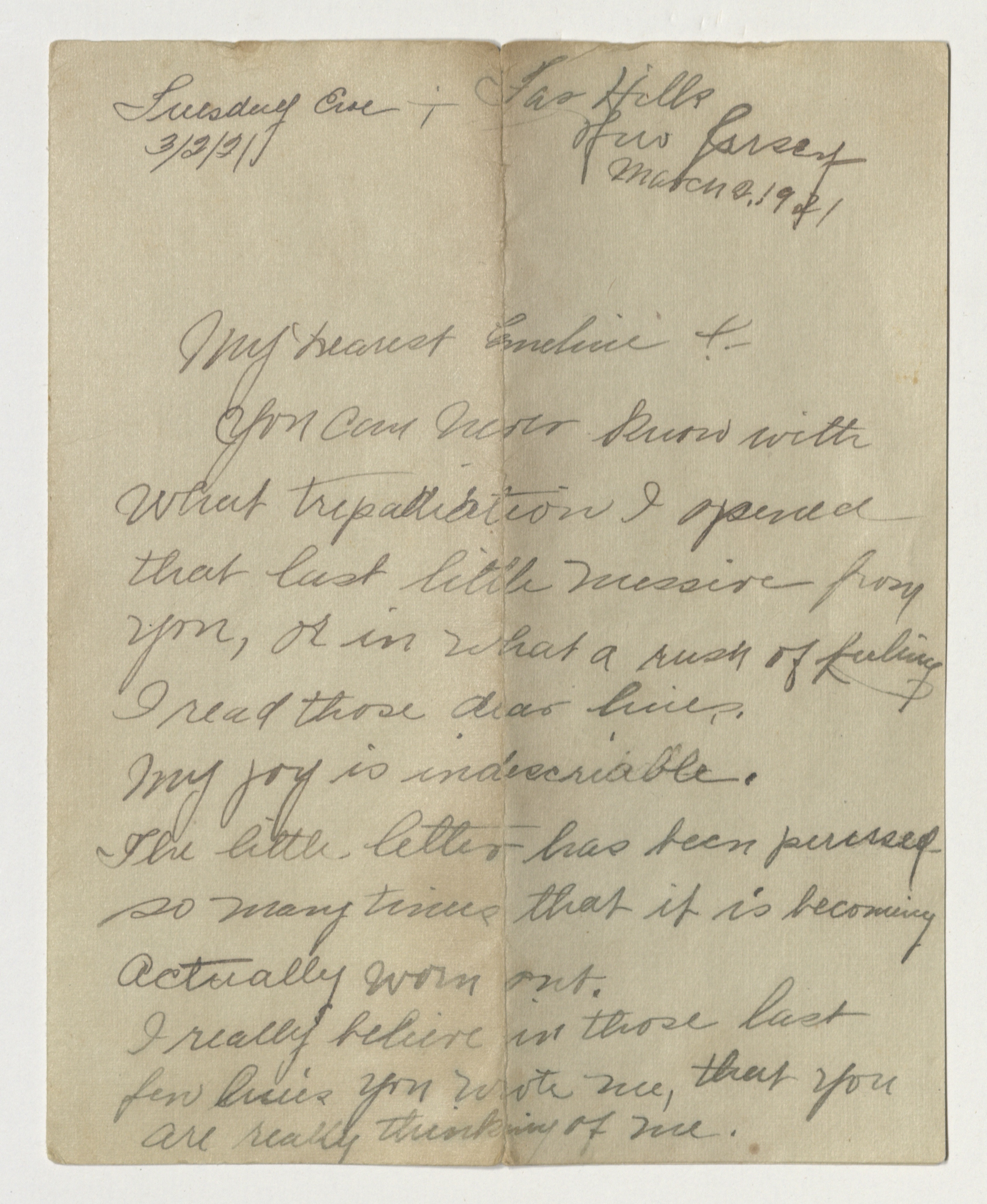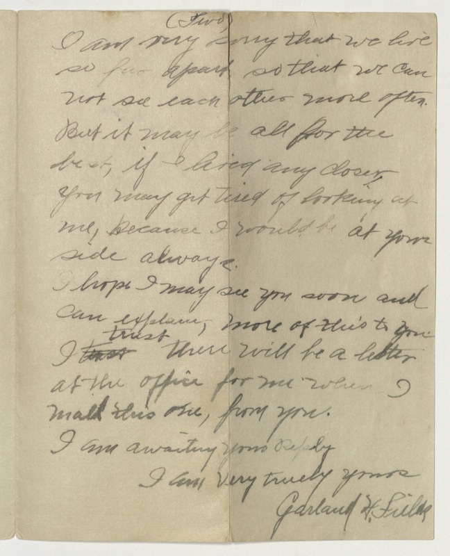 Garland Fields Sr. was the father of Beverly Mills's uncle, Garland Fields Jr. Beverly's grandfather. These love letters describe their courtship and his strong feelings for Emeline, who ultimately did not marry him. Letters had been framed, images attached, and removed for digitization.