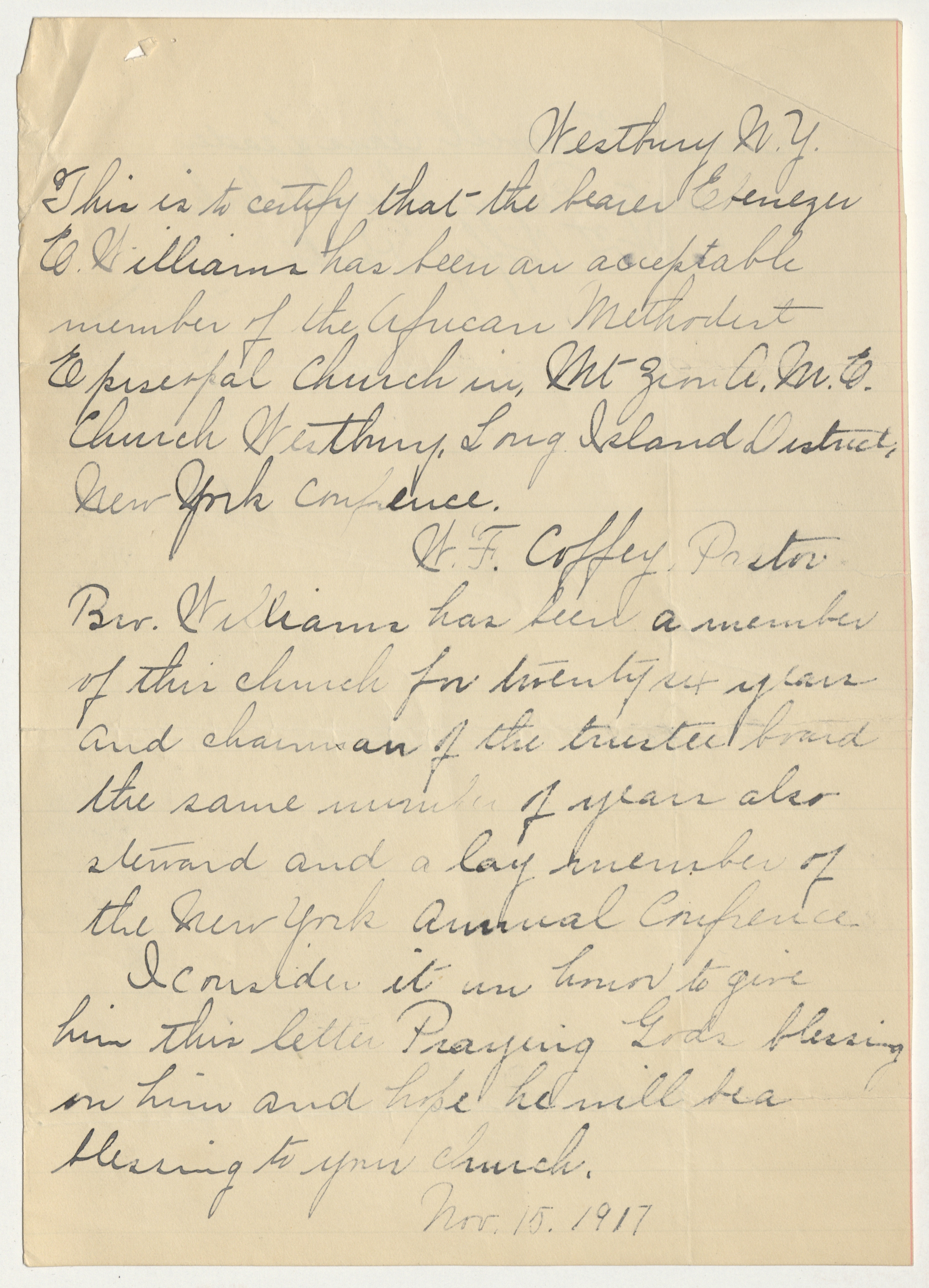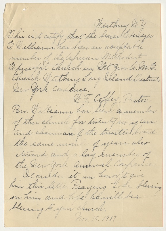 Recommendation Letter for Deacon Ebenezer Williams. The Deacon's pastor, Pastor Bleax, writes a letter of support summarizing his character, service and contribution to Mt Zion African Methodist Episcopal Church of Westbury, Long Island, NY. Though not specifically stated, it is believed that the intended recipient of the letter would have been church leadership at Mother Bethel African Methodist Episcopal Church in Philadelphia.