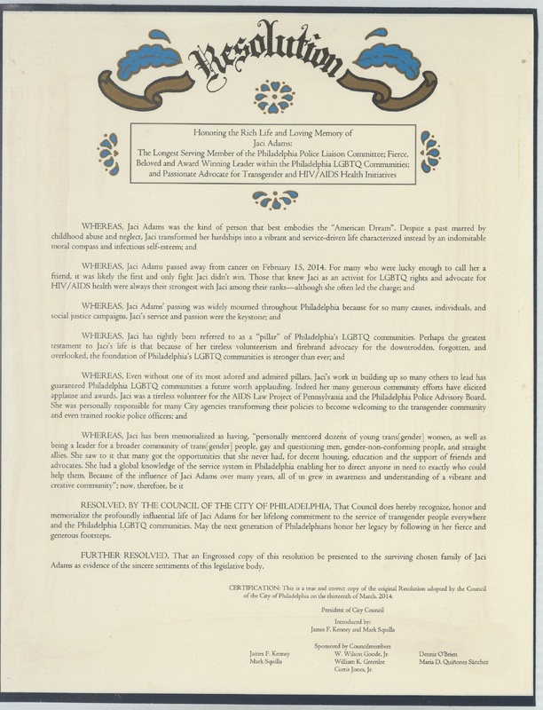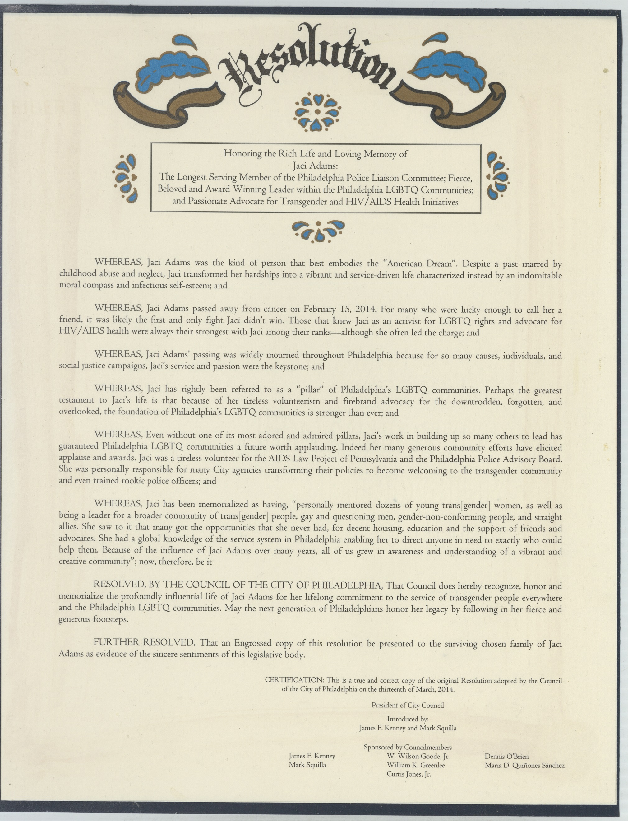 Council of the City of Philadelphia, Resolution Honoring the Rich Life and Loving Memory of Jaci Adams