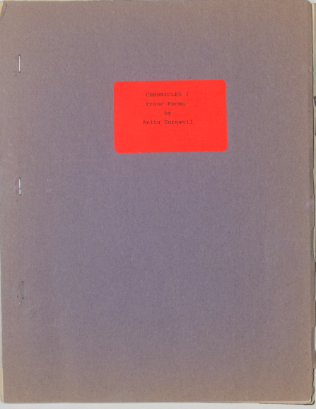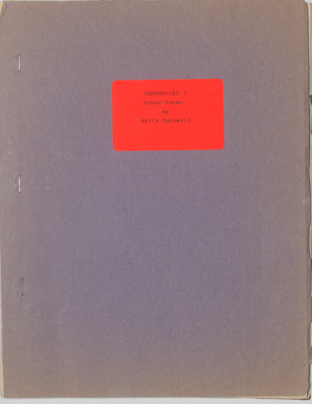 Anita Cornwell (1923 - 2023). Ms Cornwell’s “Chronicles 1, Prose Poems in 1986” is captured in digital form. The document opens with a dedication to Cornwell’s mother and a short biography highlighting her career as a writer and playwright, followed by the table of contents that lists five poems.
