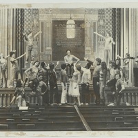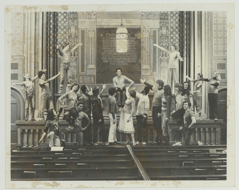 Likely taken during a pre-production rehearsal at a nearby church, as suggested by the rows of pews and hymnals in the foreground.