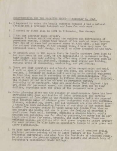 At the time of these responses, she was 48 years old (page 3 of 5). It was said that “Howell provided glamour and was glamorous herself” (Smith 2015, p. 77). As indicated in response #23, Howell was born in Princeton, attended Princeton High School where she was one of the first African-Americans to graduate, pursued higher education in France studying chemistry in 1932 and 1933, and then returned to Princeton until moving to New Brunswick, NJ later in life (pages 2 and 3 of 5; Smith 2015, p. 77). Her father William Powell Moore (April 1863 or 1867-1920) owned 4, 6, and 10 Spring Street in Princeton (Satterfield, S., and Historical Society of Princeton, n.d.). From 1921-1940, she operated Christine Vanity Parlors (as the sign in the building window read) or Christine’s Beauty Salon. In 1935, she founded Christine Cosmetics, Inc. (page 2 of 5). The cosmetic business was co-operated with Mr. Louis DuBois of New Brunswick in New Brunswick, though eventually moved to Princeton in her beauty parlor (page 2 of 5). As indicated in response #20, all items ingredients are of her creations (page 2 of 5). She sold powder base and face powder for all skin tones, various other facial and makeup products, and hair products (Satterfield, S., and Historical Society of Princeton, n.d.). The questionnaire details her career and business in beauty, as well as her passions, perspectives, life in Princeton, clientele, and personal life.