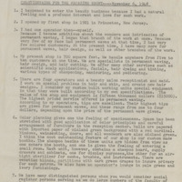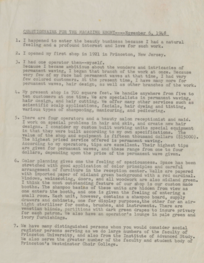 This questionnaire entitled “QUESTIONNAIRE FOR THE MAGAZINE EBONY----November 6, 1948” is five pages long with responses to 38 questions. The responses are by Christine Moore Howell (March 19, 1898-December 13, 1972) of Princeton, New Jersey.