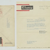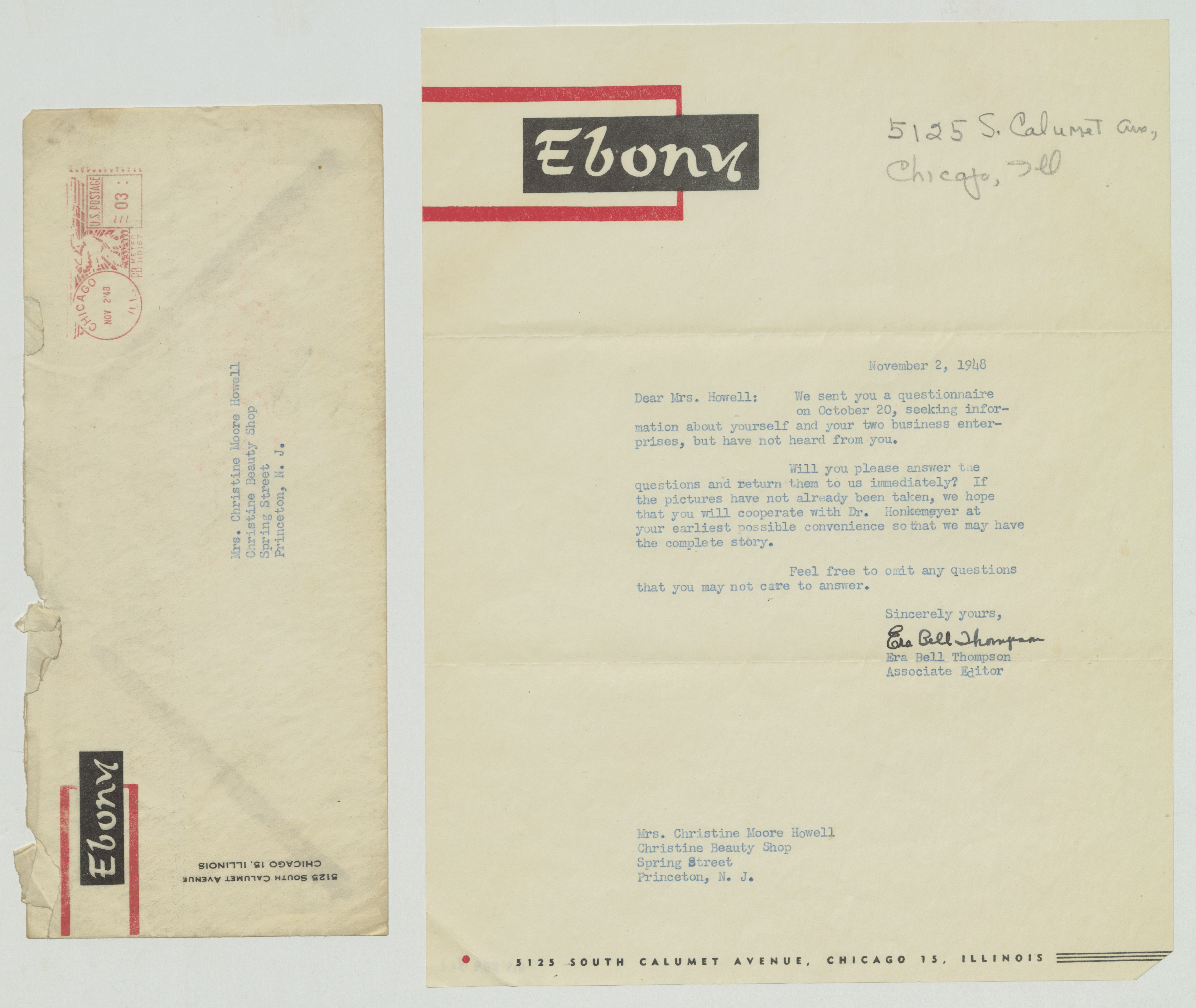 Letter. Era Bell Thompson, Associate Editor to Christine Moore Howell. 1948 November 2. On Ebony letterhead. Requesting answers to questionnaire. With envelope addressed to Christine Beauty Shop / Spring Street / Princeton, N.J.