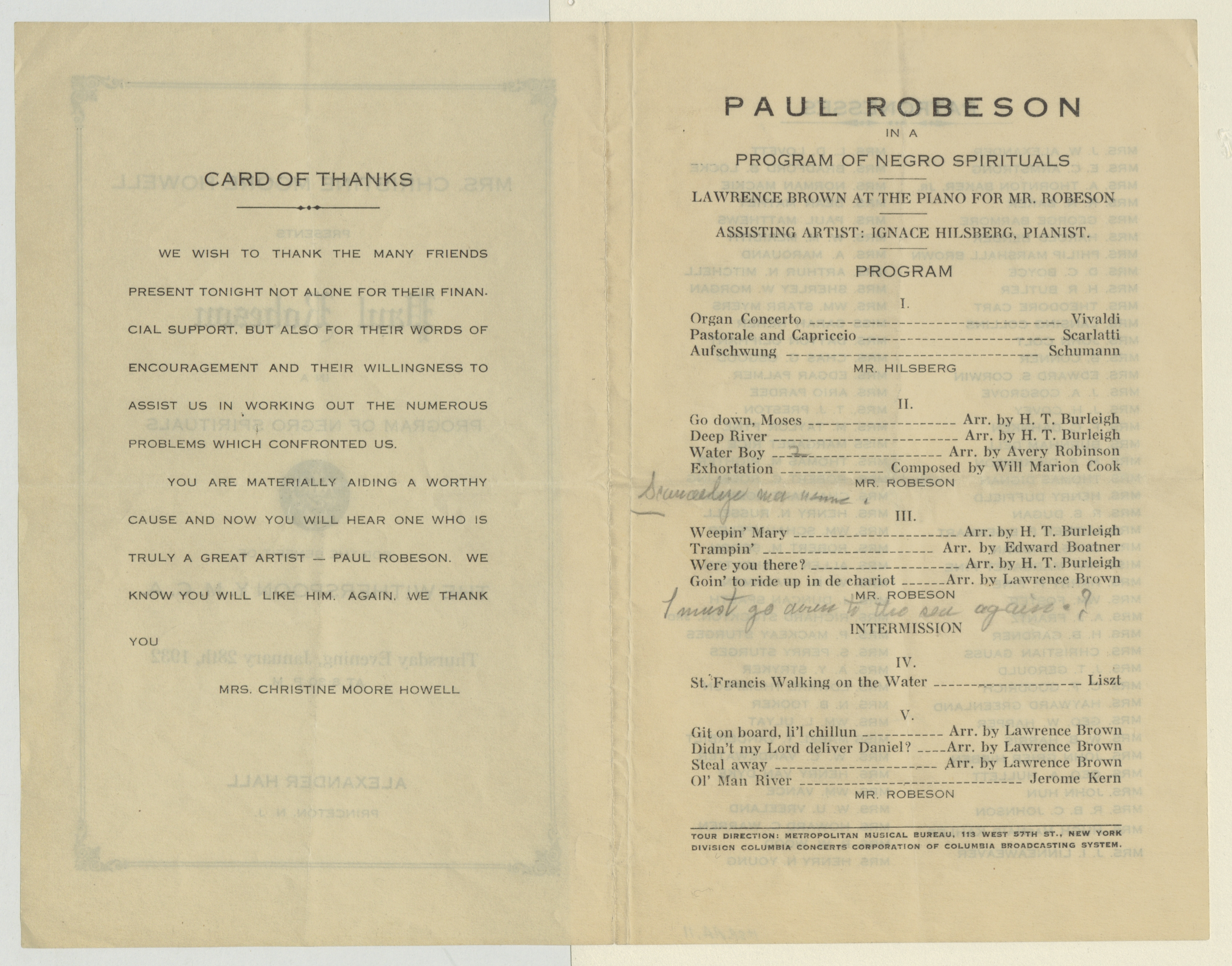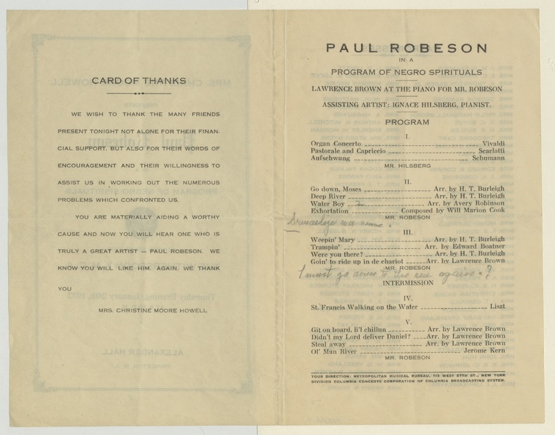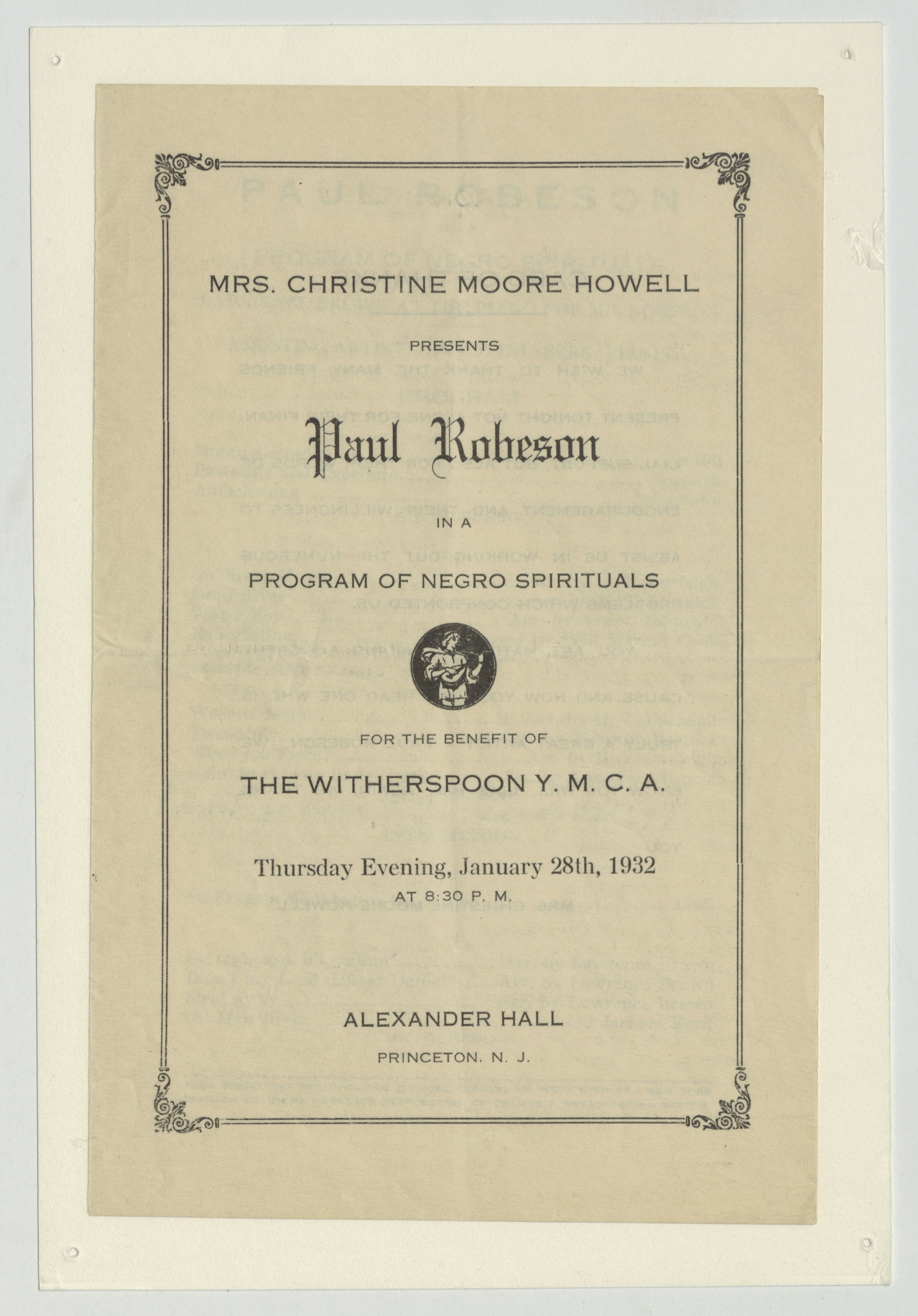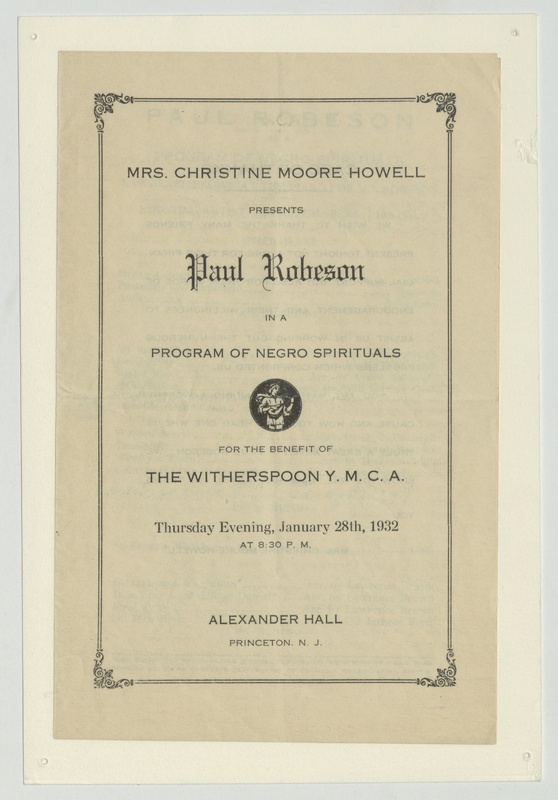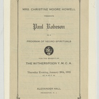 Mrs. Christine Moore Howell presents Paul Robeson in a Program of Negro Spirituals for the Benefit of the Witherspoon Y.M.C.A. 1932 January 28.