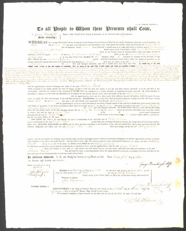 Land Deed, Matthias Ranck seller to George Dyer; Lancaster, PA