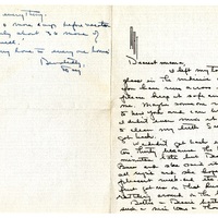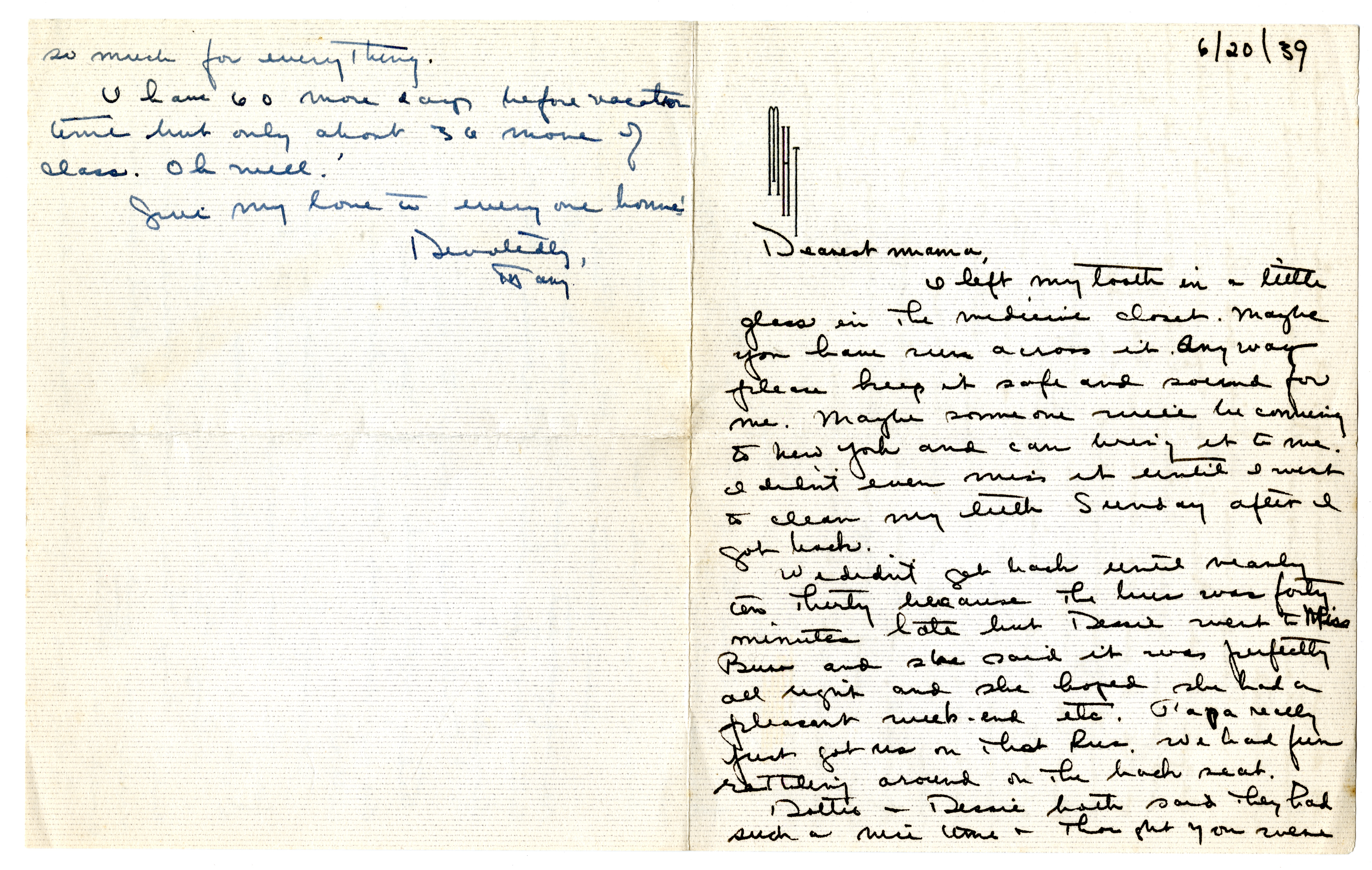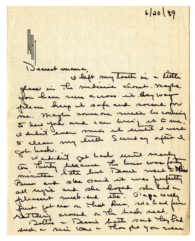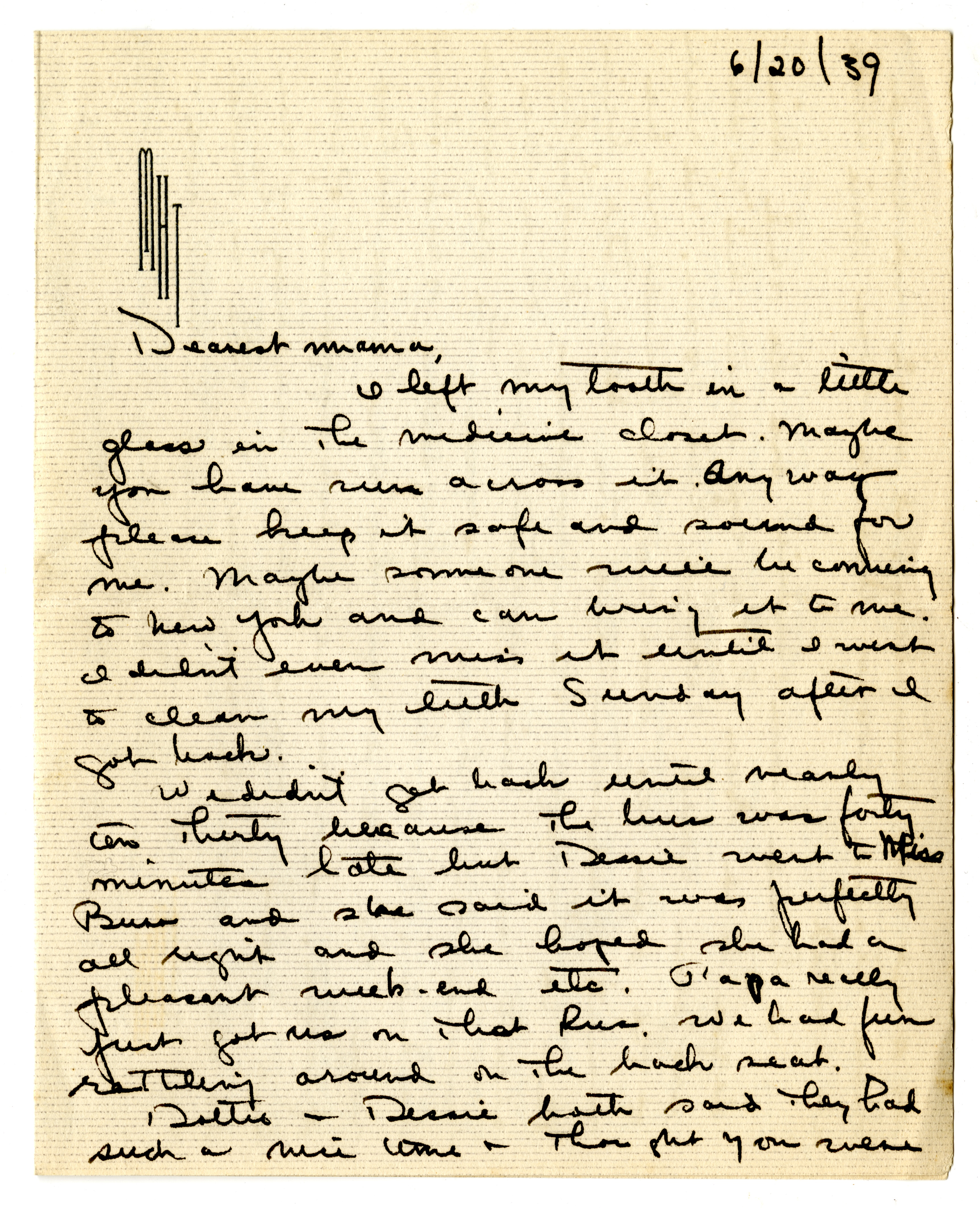 Mary, the letter writer, tells her mother she accidentally left a tooth in a glass in the medicine cabinet and asks her to keep it safe until someone can bring it to them. She describes returning late from a weekend visit due to a bus delay, noting that friends Dottie and Deasie enjoyed the trip.