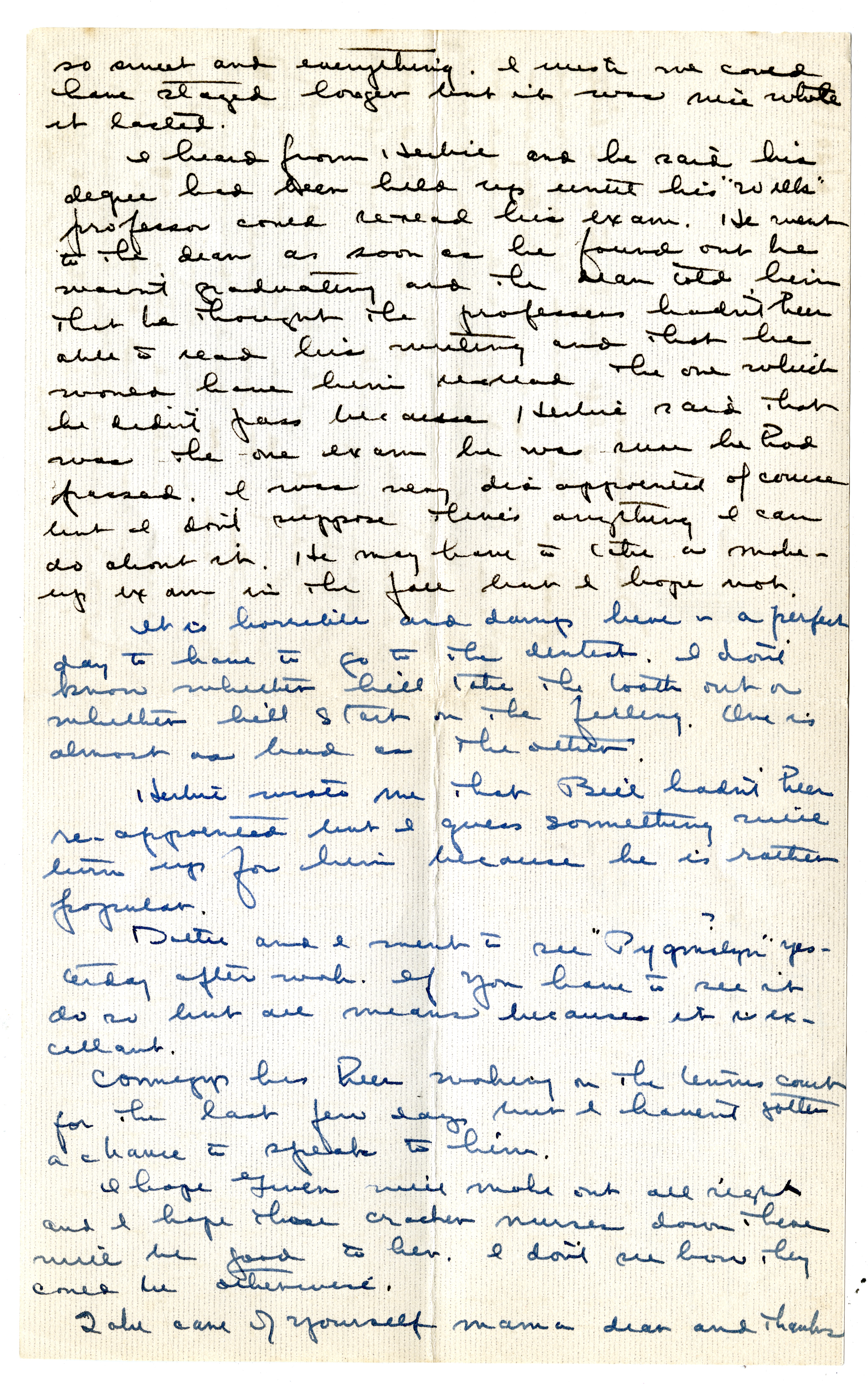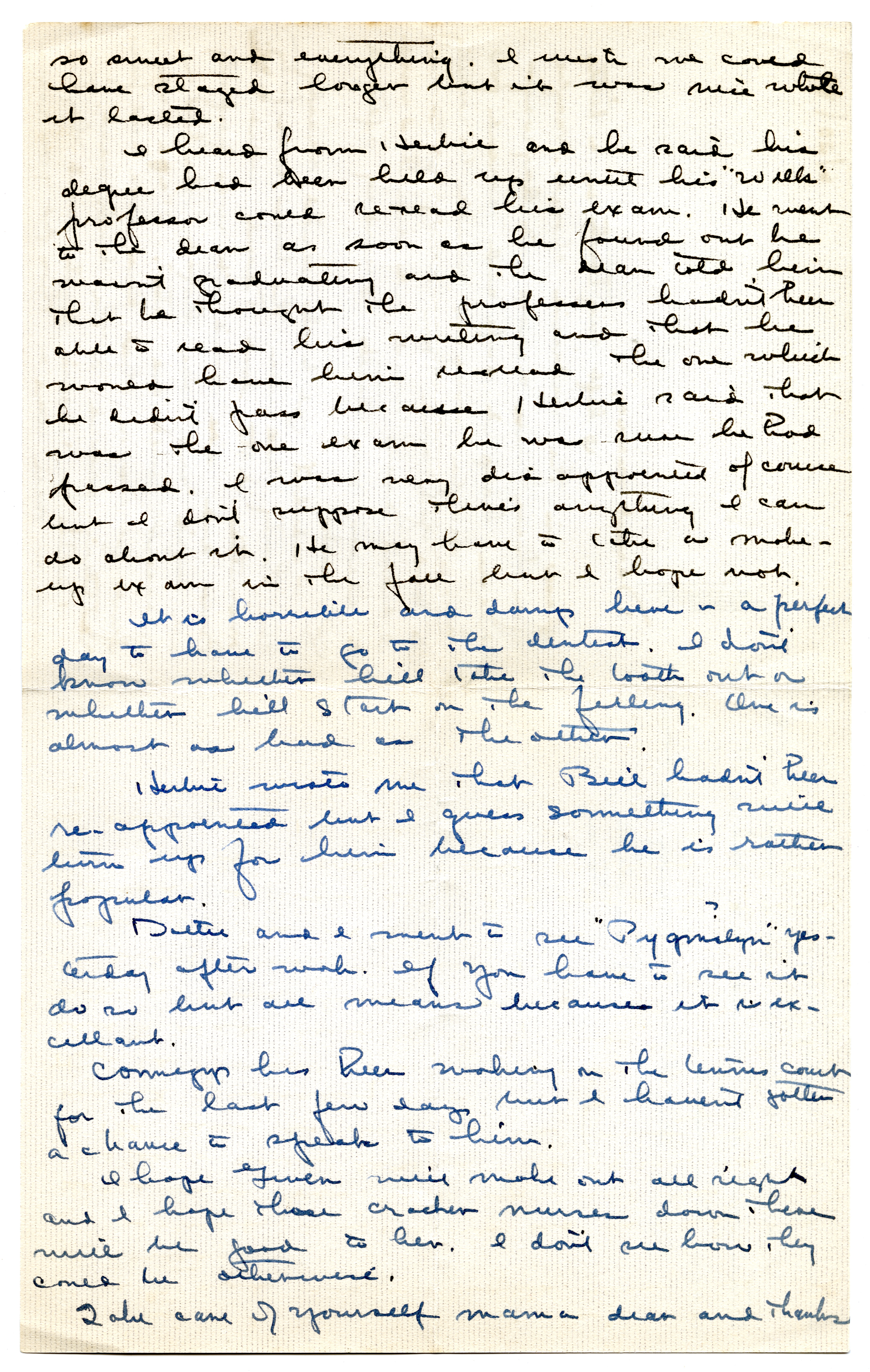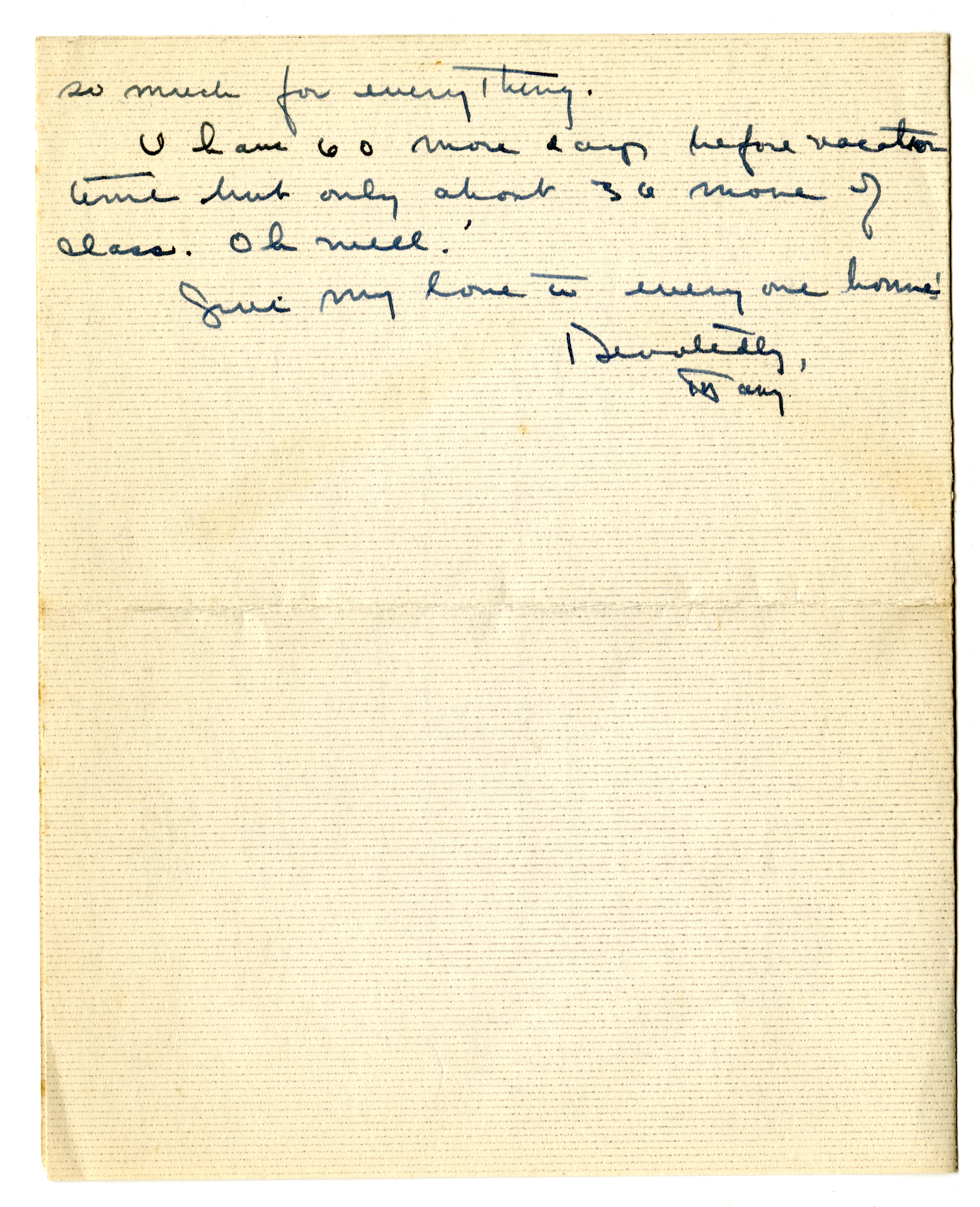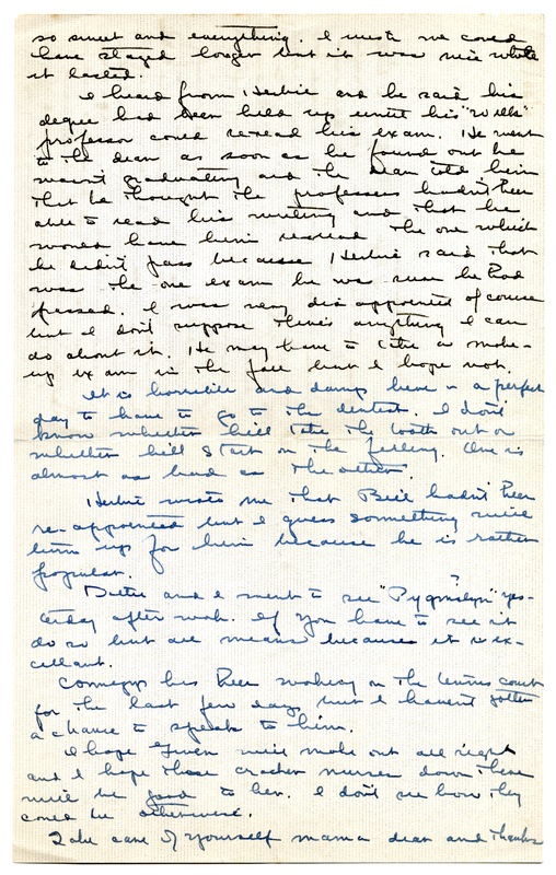 She shares disappointing news that Herbie’s graduation was delayed because a professor couldn’t read his handwriting on a “Wills” exam, possibly requiring a make-up test in the fall. The writer has a dental appointment and is unsure whether the dentist will pull a tooth or fill it. Mary informs that Bill was not reappointed to his position but hope something else will come up for him, and she recommends seeing “Pygmalion,” which she enjoyed with Dottie. They note someone has been working at the court but haven’t spoken to him, express hope that Gwen will be well-treated by her nurses, and mention having 60 days until vacation and 36 days of classes remaining. The letter closes with thanks and love to everyone at home.