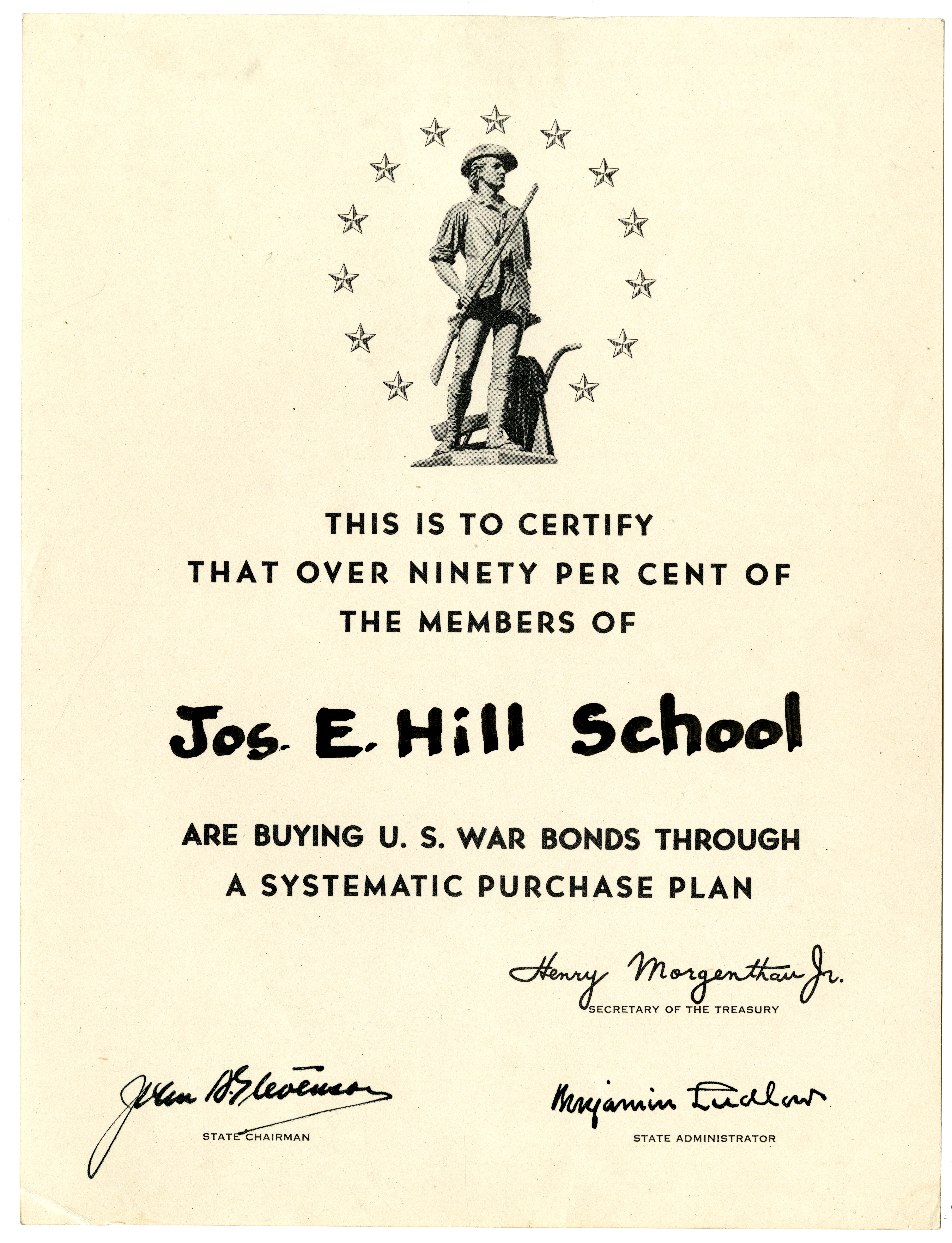 Certificate of Joseph E. Hill School buying U.S. war bonds through a systemic purchase plan.