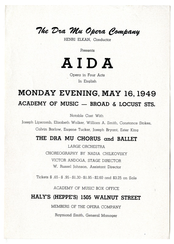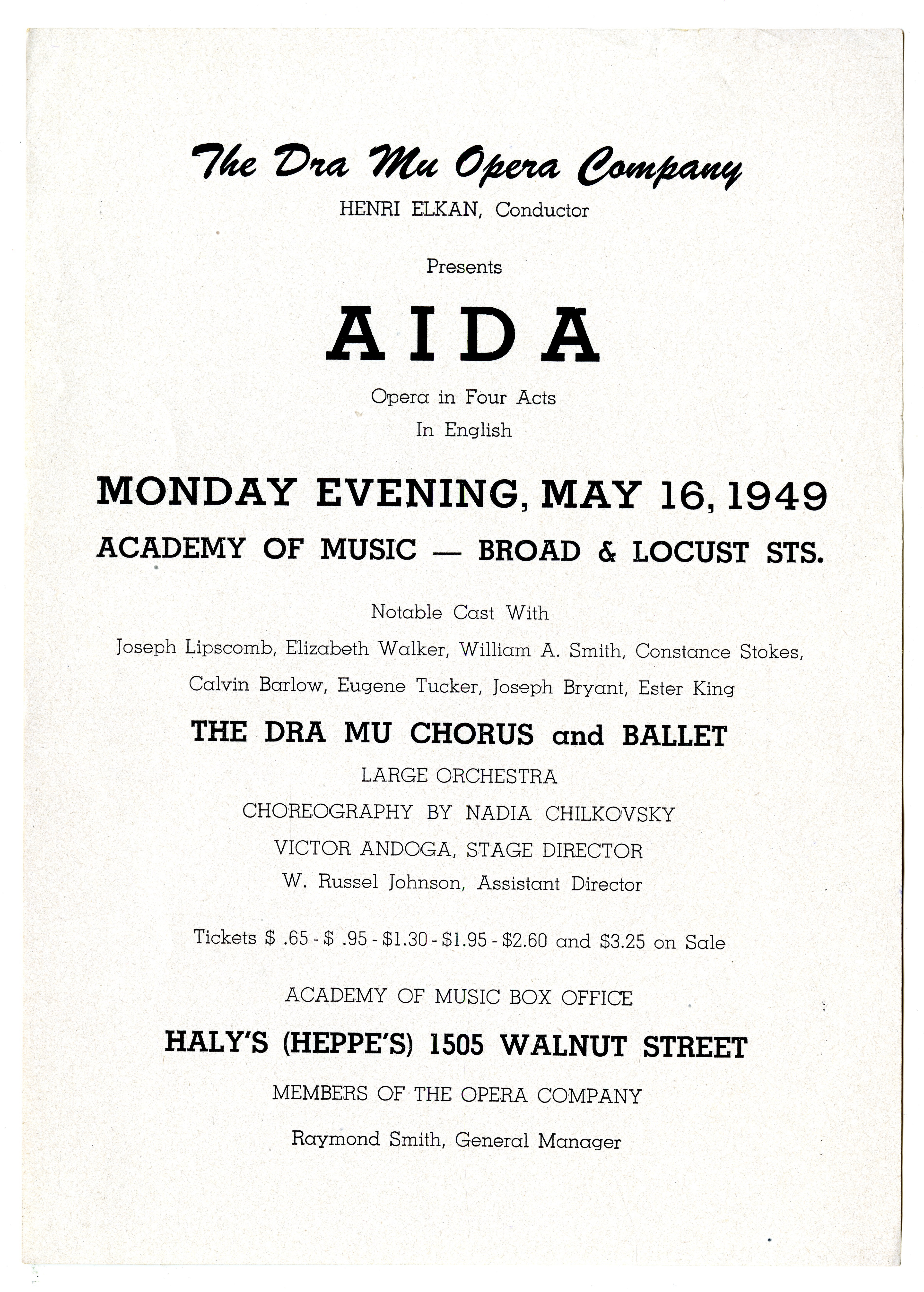 The Dra-Mu Opera Company, "Dra-Mu", was a significant Black opera company in Philadelphia, active during the mid-20th century. Co-founded by Raymond L. Smith and Henri Elkan (Van Atta 1980), the company provided a platform for Black artists to perform operatic works at a time when opportunities in mainstream opera were limited due to racial discrimination.