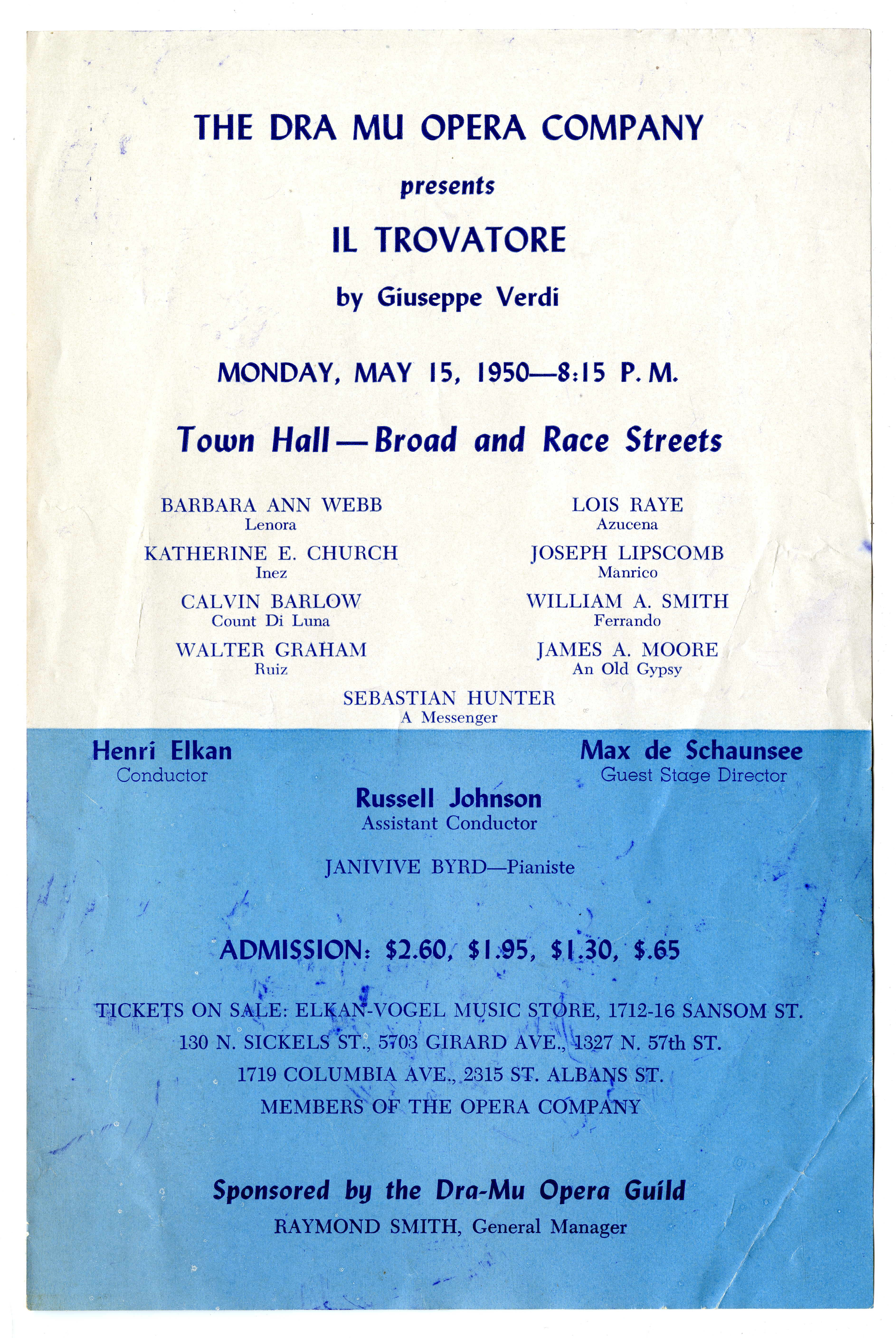 The Dra-Mu Opera Company, "Dra-Mu", was a significant Black opera company in Philadelphia, active during the mid-20th century. Co-founded by Raymond L. Smith and Henri Elkan (Van Atta 1980), the company provided a platform for Black artists to perform operatic works at a time when opportunities in mainstream opera were limited due to racial discrimination.
