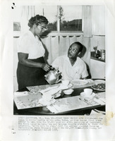 This item is a black and white glossy photograph of William and Daisy Myers having dinner in their Levittown home. The couple are dressed in casual attire as William sits at the table while Daisy pours him coffee. When Levittown was first created the housing agreements included racist policies barring people of color from living in the community. The Myers became the first Black family to move into the 15,000 home all-White Levittown community in Bristol Township. They moved out of the integrated housing community of Bloomsdale to 43 Deepgreen Lane in Levittown, PA in August 1957. -
