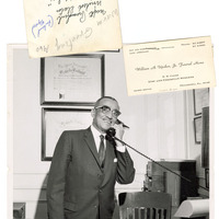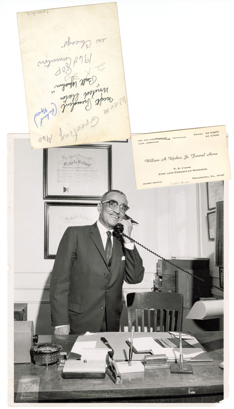 A black and white photograph taken by John W. Mosley (1907-1969) featuring William Arthur Upshur Jr. (1894-1963) on the phone at his office desk. His business card for his funeral home is stapled to the photo. Another photo flipped right side down sits above. It has handwritten inscriptions.