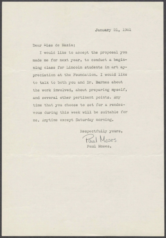 This correspondence from Paul Moses to Violette de Mazia on January 21, 1951 details an acceptance from Moses to begin teaching art appreciation for Lincoln University students at the Barnes Foundation.