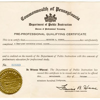 This certificate from the Commonwealth of Pennsylvania Department of Public Instruction’s Bureau of Professional Licensing Pre-Professional Qualifying Certificate was granted to Georgine E. Upshur for completion of a four-year secondary school course in 1941. This was a modified certificate given to Black educators.